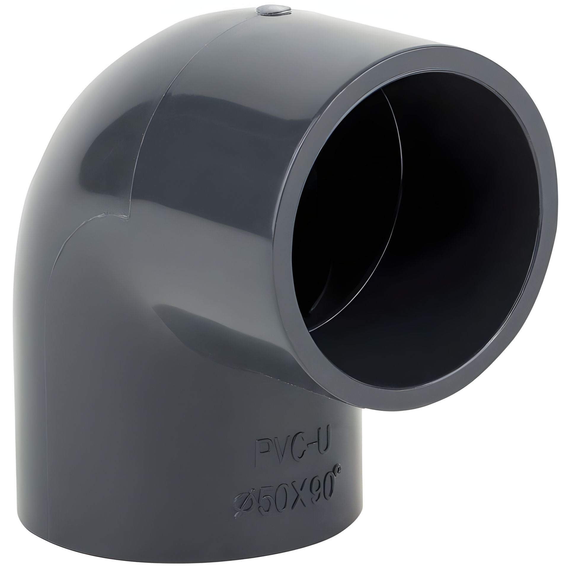 Коліно має кут повороту 90 градусів і сірий колір. Для з'єднань з трубами використовується спеціальний ПВХ клей. Перед наклеюванням поверхню труби знежирюють, змащують клеєм, стики з'єднуються, провертають, тримаємо 30 секунд - готово.
