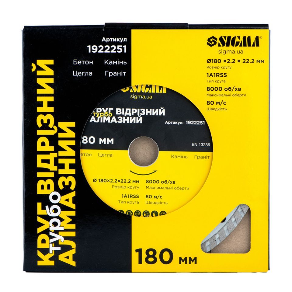 Коло відрізне алмазне "Турбо" Ø180×2.2×22.2мм, 8000об/хв SIGMA 1922251