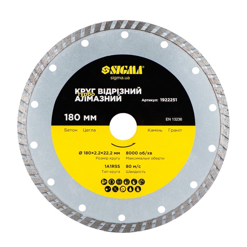 Коло відрізне алмазне "Турбо" Ø180×2.2×22.2мм, 8000об/хв SIGMA (1922251)