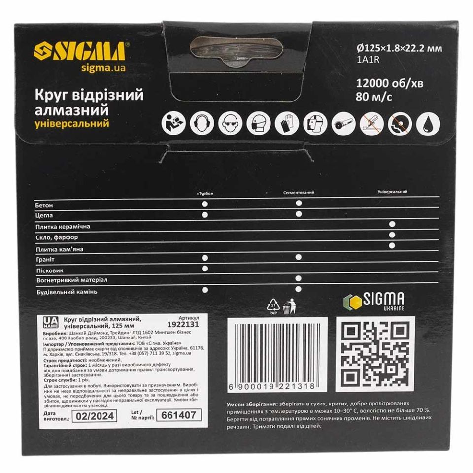 Коло відрізне алмазне універсальне Ø125×1.8×22.2мм, 12000об/хв SIGMA (1922131)