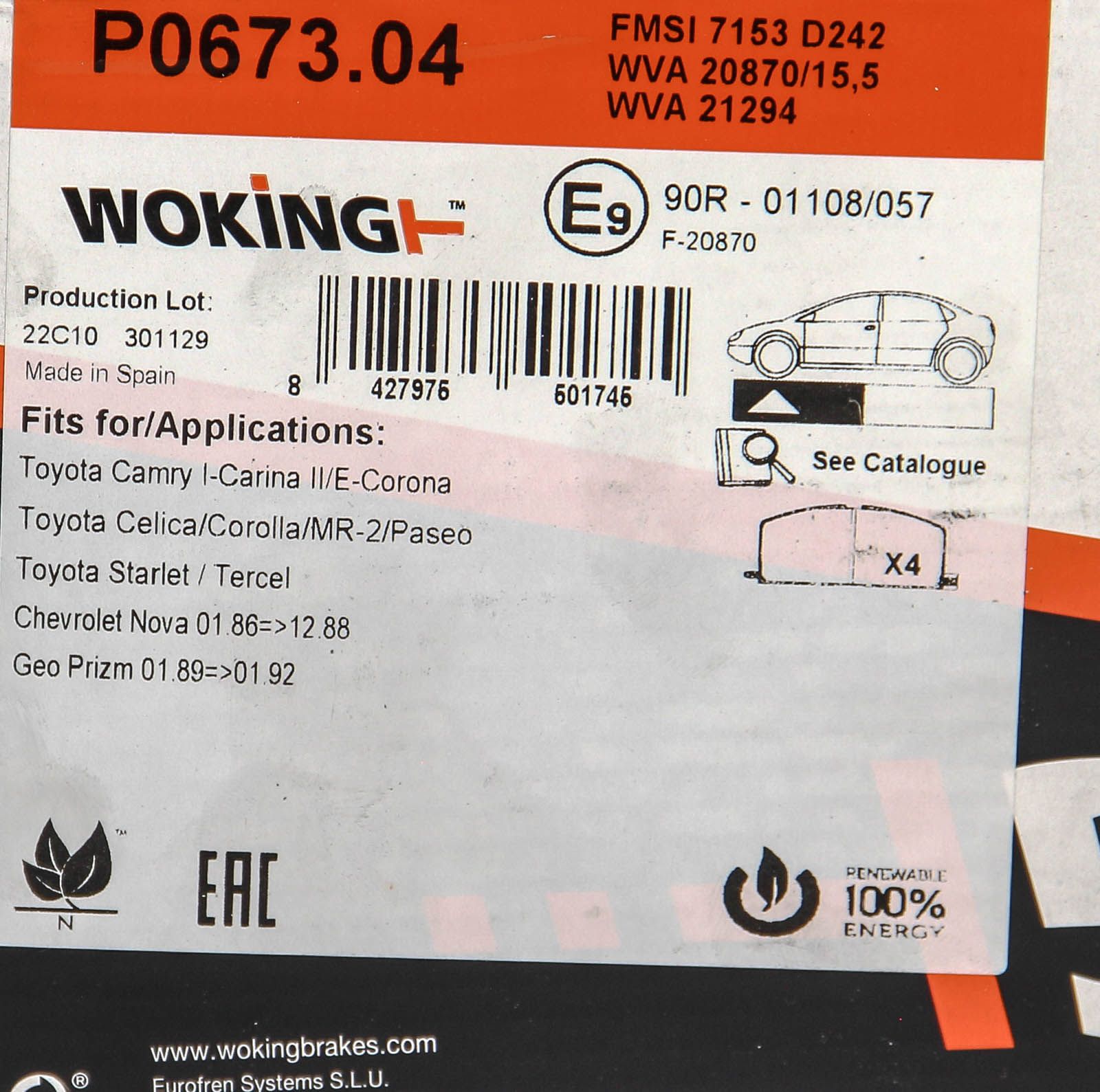 Передні гальмівні колодки Camry/Carina/Celica/Corolla/Tercel (83-02), WOKING (P067304)