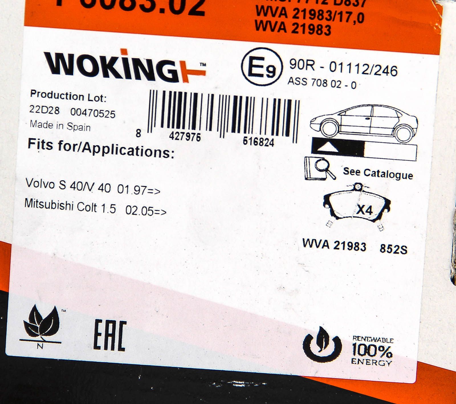 Передні гальма S40/V40 95-04, Woking (P608302)