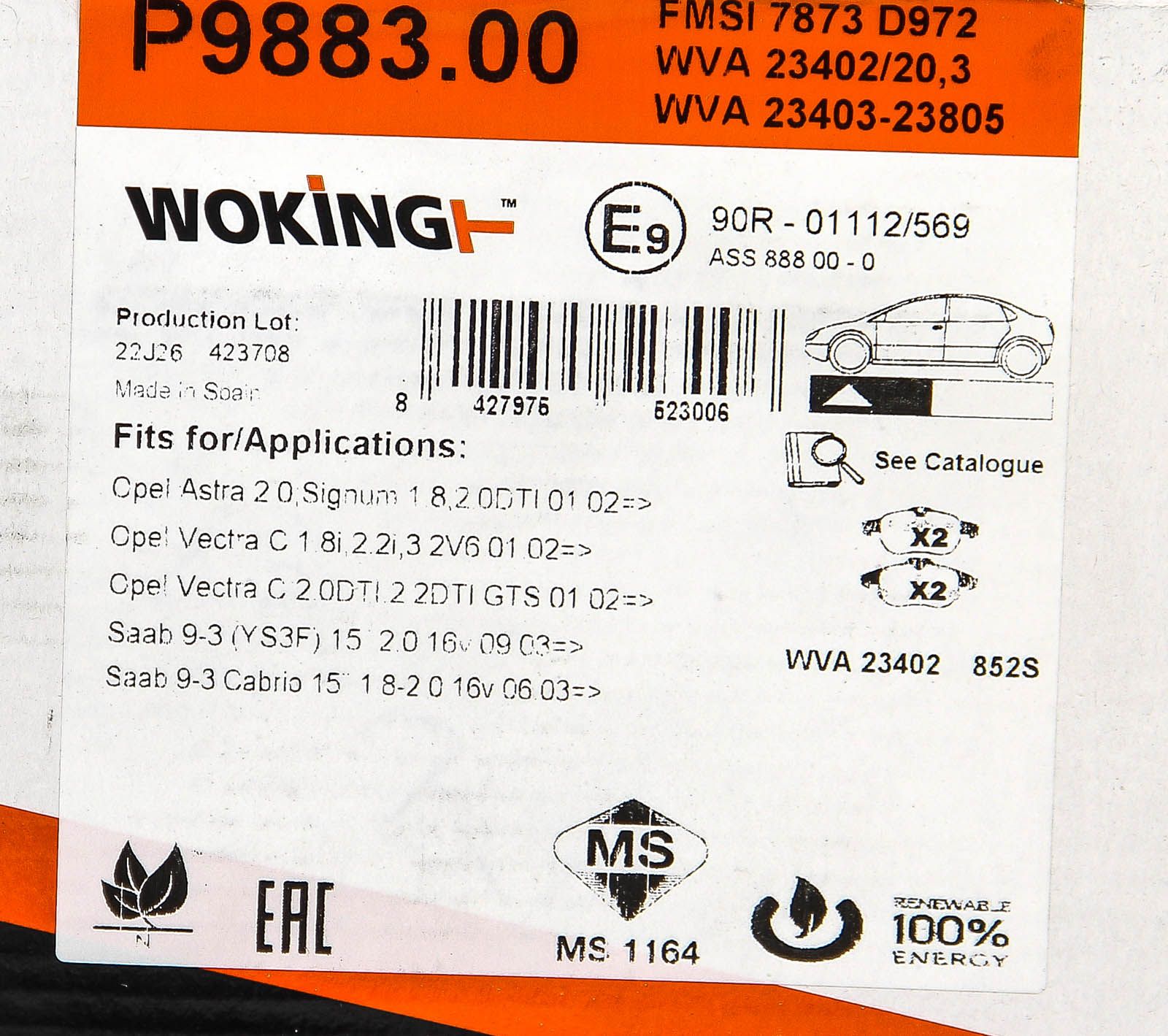Гальмівні передні колодки Vectra C 02-, WOKING (P988300)