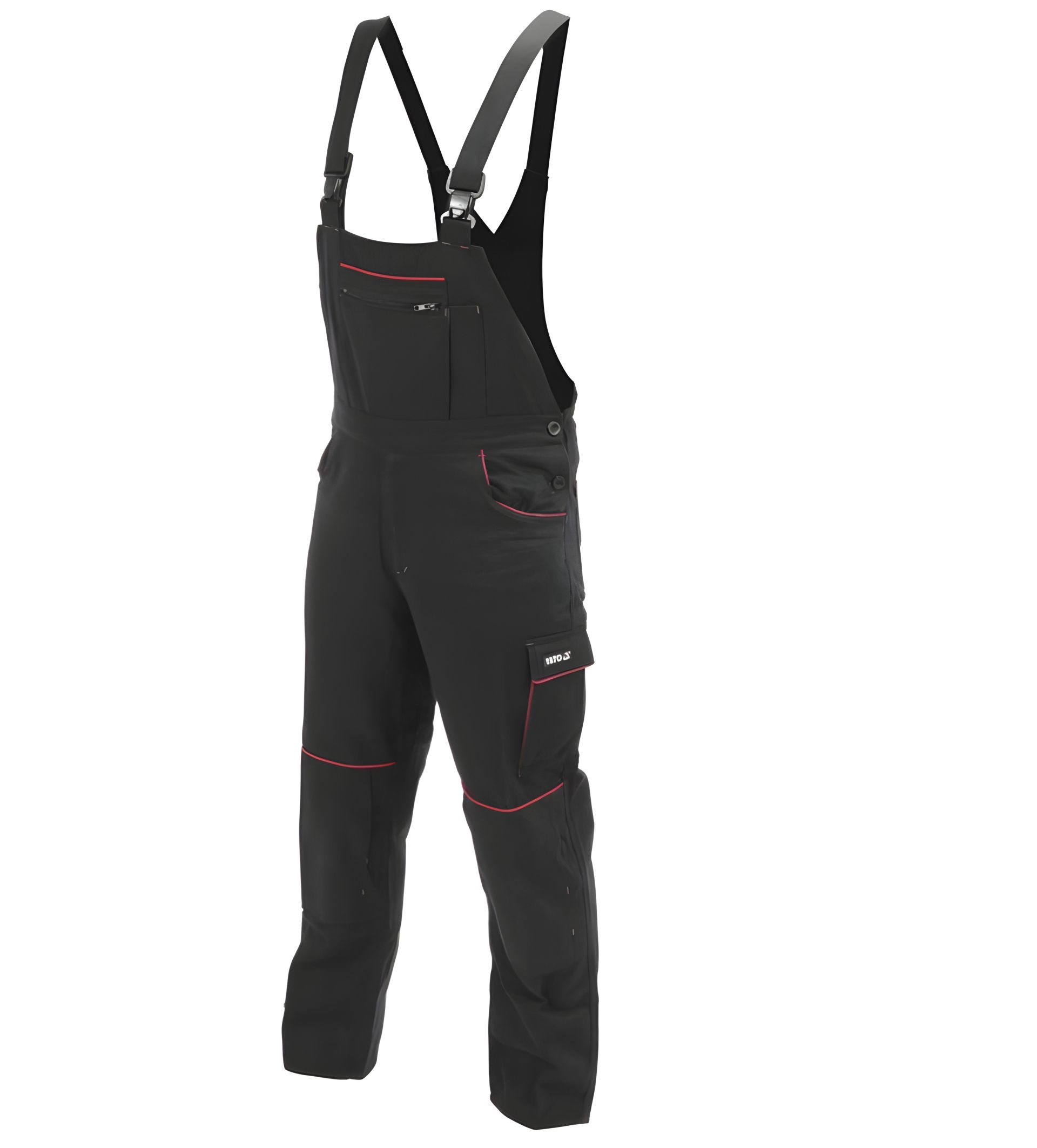 Організуйте свій робочий процес за допомогою дев'яти карманів, включаючи великий нагрудний карман на блискавці та петлю для молотка. Тканинні підтяжки з регулюванням і резинкою ззаду. Пуговиці з регульованою шириною талії з боків, і резинка ззаду. Наколінники із застібкою на липучці на колінах. Штанини темного кольору з червоними лініями, які, крім декоративної функції, зміцнюють краї відкритих карманів та захищають їх від розривів.