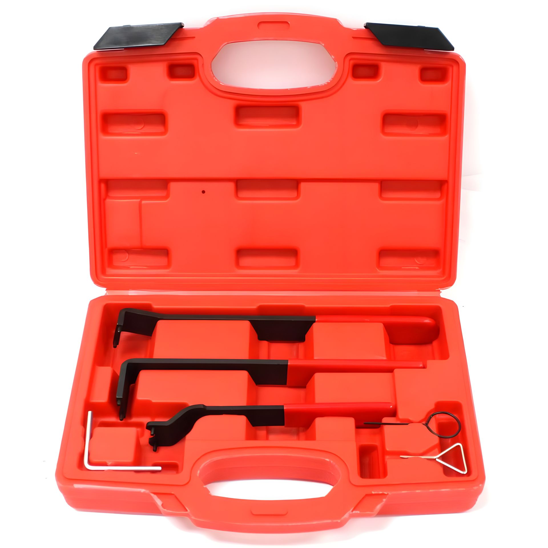 Інструменти з набору запобігають усуванню ременя при затягуванні гайки, забезпечуючи точність регулювання. Включає три ключі для роликів натягувача з різною довжиною та формою, а також три фіксатори для ключів зубчастого ременя, що відповідають оригінальним стандартам.