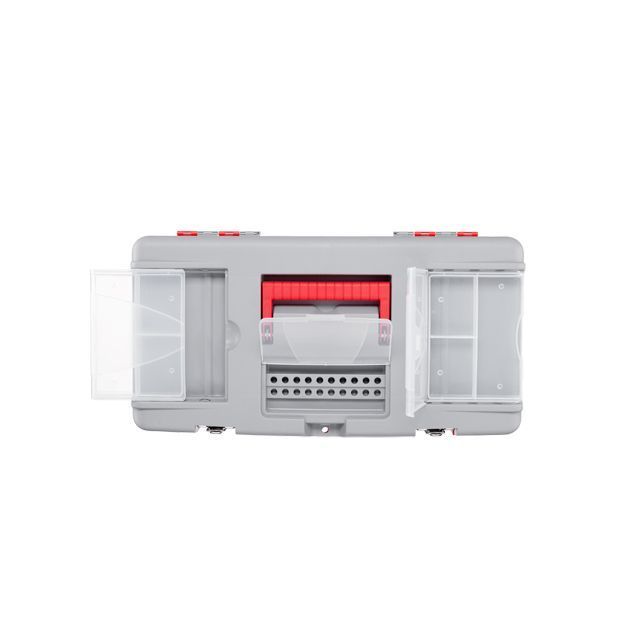 На кришці кожного ящика розташовано два знімні органайзери, які відмінно підійдуть для зберігання металовиробів або будь-якої іншої дрібниці. Також зверху передбачено відсік для біт, який закривається прозорою кришкою. Усередині ящиків розміщена полиця, яка відмінно підійде для зберігання губцевого та іншого невеликого інструменту, що часто використовується.