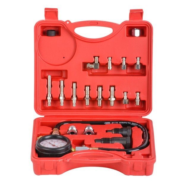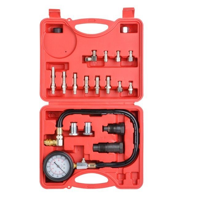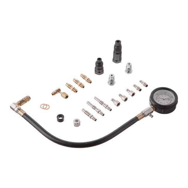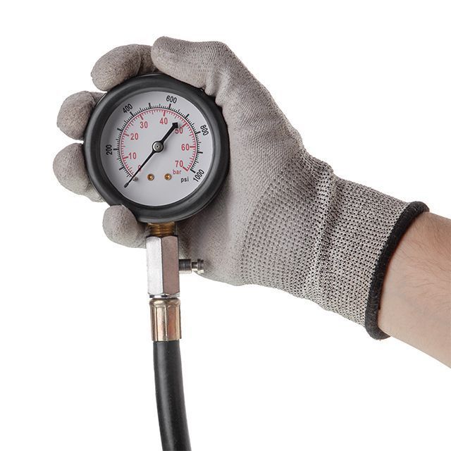 Міцні елементи манометра у прогумованому корпусі з армованим шлангом забезпечують надійне утримання тиску. Завдяки гнучкості шланга компресометром можна працювати у важкодоступних місцях з обмеженим доступом. Після вимірювання тиск скидається натисканням на бічний клапан, а стрілка манометра встановлюється на нульове значення шкали.