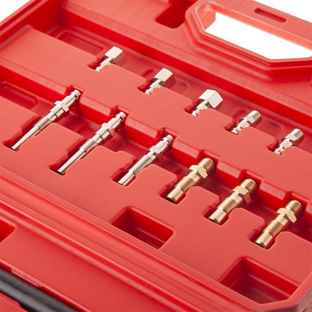 Великий манометр з показниками легко зчитується для комфортної роботи, має дві найбільш популярні шкали вимірювання: 0-70 Bar і 0-1000 PSI. Інструмент укомплектований в міцний пластиковий кейс із персональними посадковими місцями під кожен елемент. Два замки забезпечують повну безпеку комплекту, а наявність ручки - зручне транспортування.