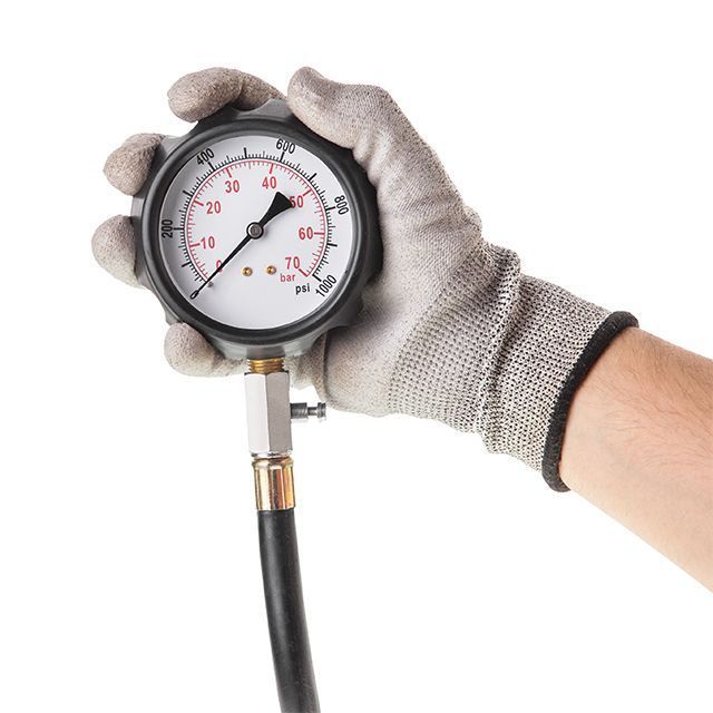 Протиударний корпус манометра разом з армованим шлангом забезпечують надійне утримання тиску. Завдяки гнучкості шланга компресометром можна працювати у важкодоступних місцях з обмеженим доступом. Після вимірювання тиск скидається натисканням на бічний клапан, а стрілка манометра встановлюється на нульове значення шкали.