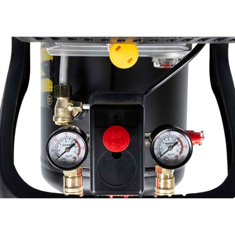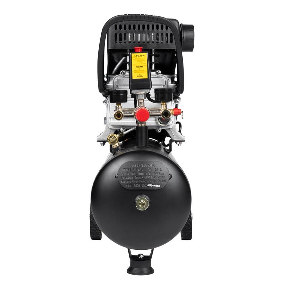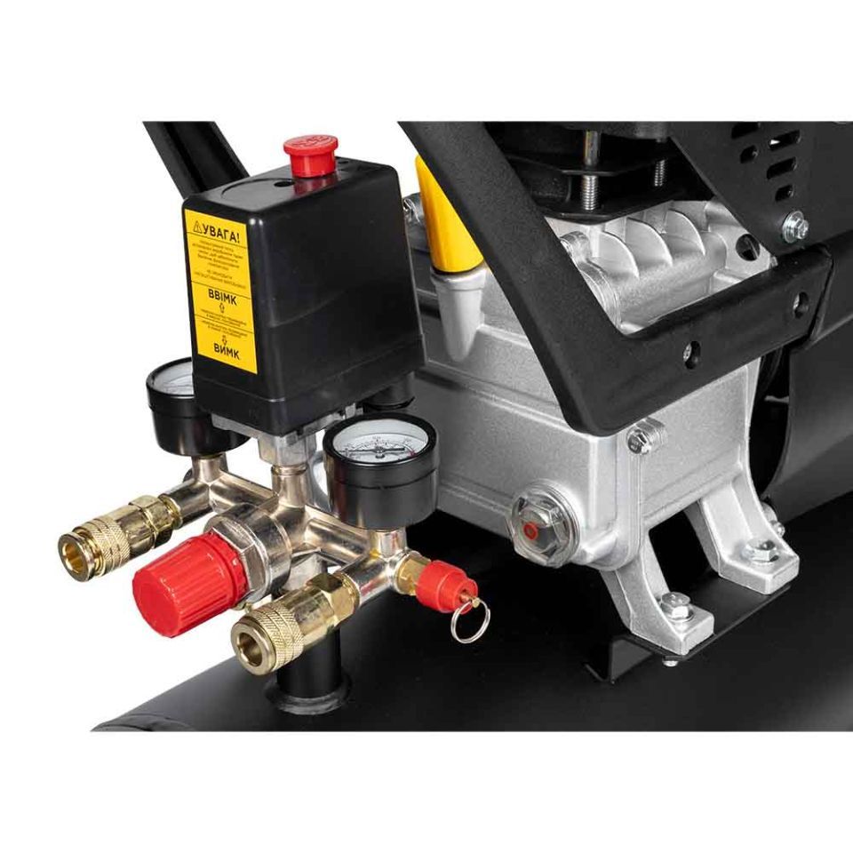 - Два манометри дозволяють контролювати тиск усередині ресивера та тиск на виході