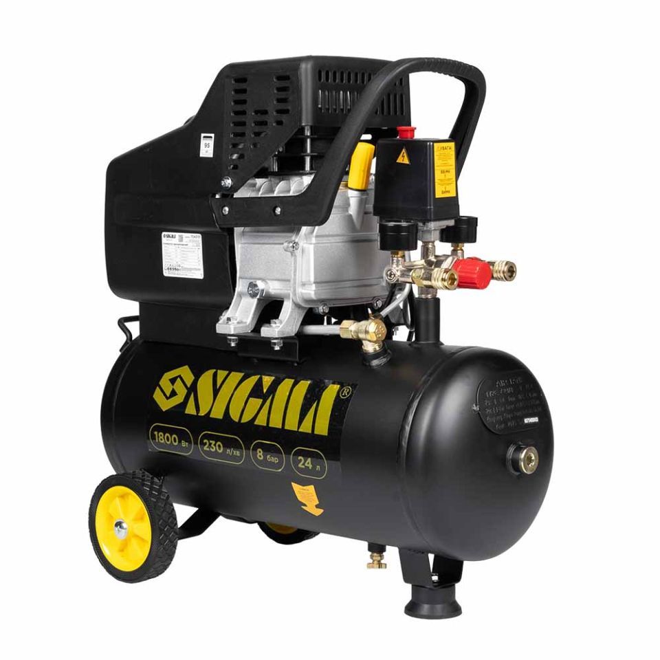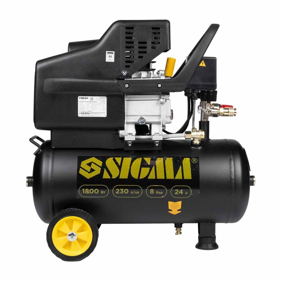 Компресор одноциліндровий 1.8кВт 230л/хв 8бар 24л (2 крана) SIGMA (7043131) призначений для нагнітання стисненого повітря з подальшою його подачею під тиском у різні типи пневмоінструменту та пневмообладнання.