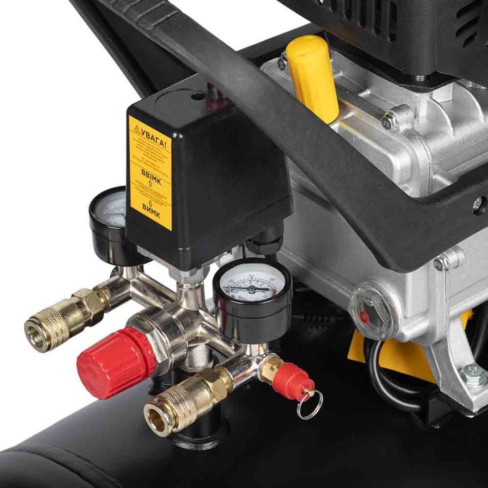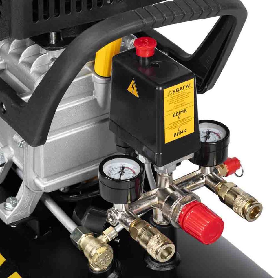 - Два манометри дозволяють контролювати тиск усередині ресивера та тиск на виході