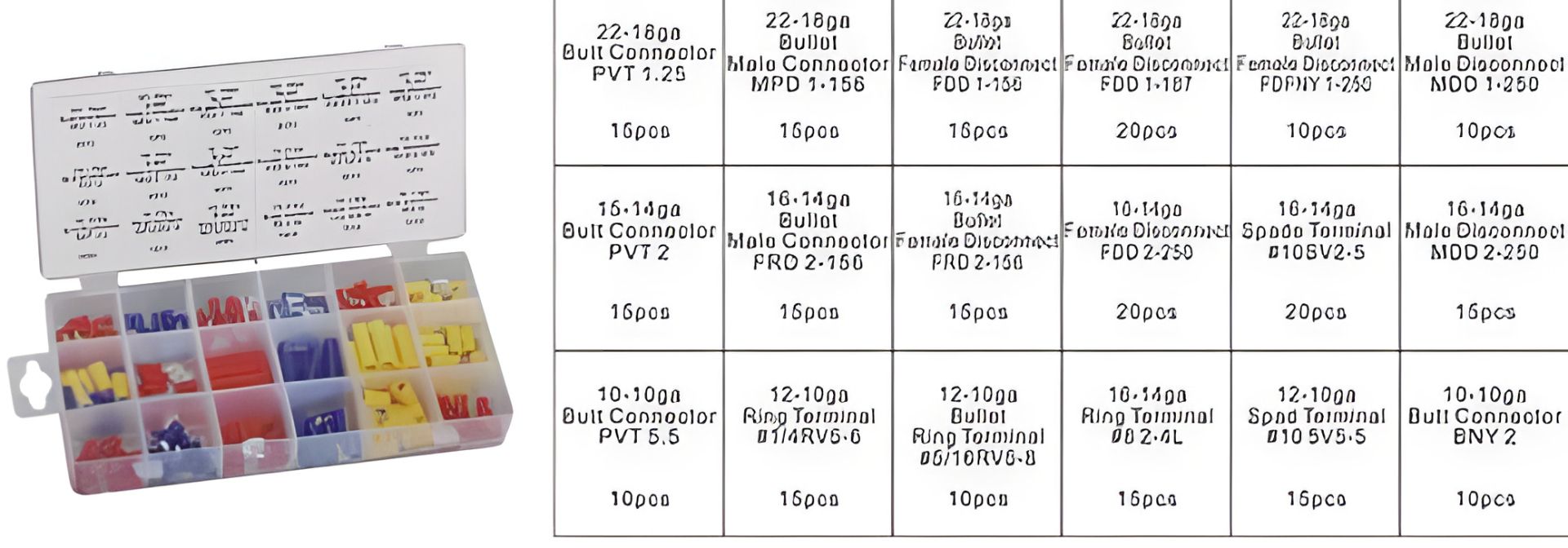 Обжимні конектори для автомобільної електропроводки Forsage F-797 є універсальним набором з 260 предметів, призначений для різних електричних проектів. Цей набір включає широкий асортимент кілець, з'єднувачів та куль для безпечного з'єднання стандартної електропроводки. Набір підходить для всіх видів електричних проектів, включаючи автомобільні електричні системи, такі як машини, каравани та автобудинки, човнові з'єднання, проекти "зроби сам" та домашні проекти.