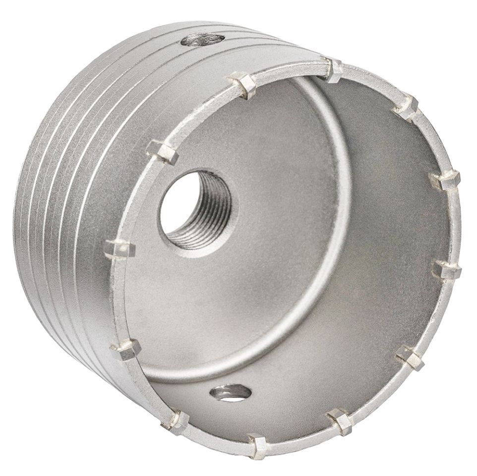 - Спеціальна спіралеподібна форма корпусу коронки зменшує тертя об стінки отвору, прискорює відведення шламу та підвищує термін служби інструменту.