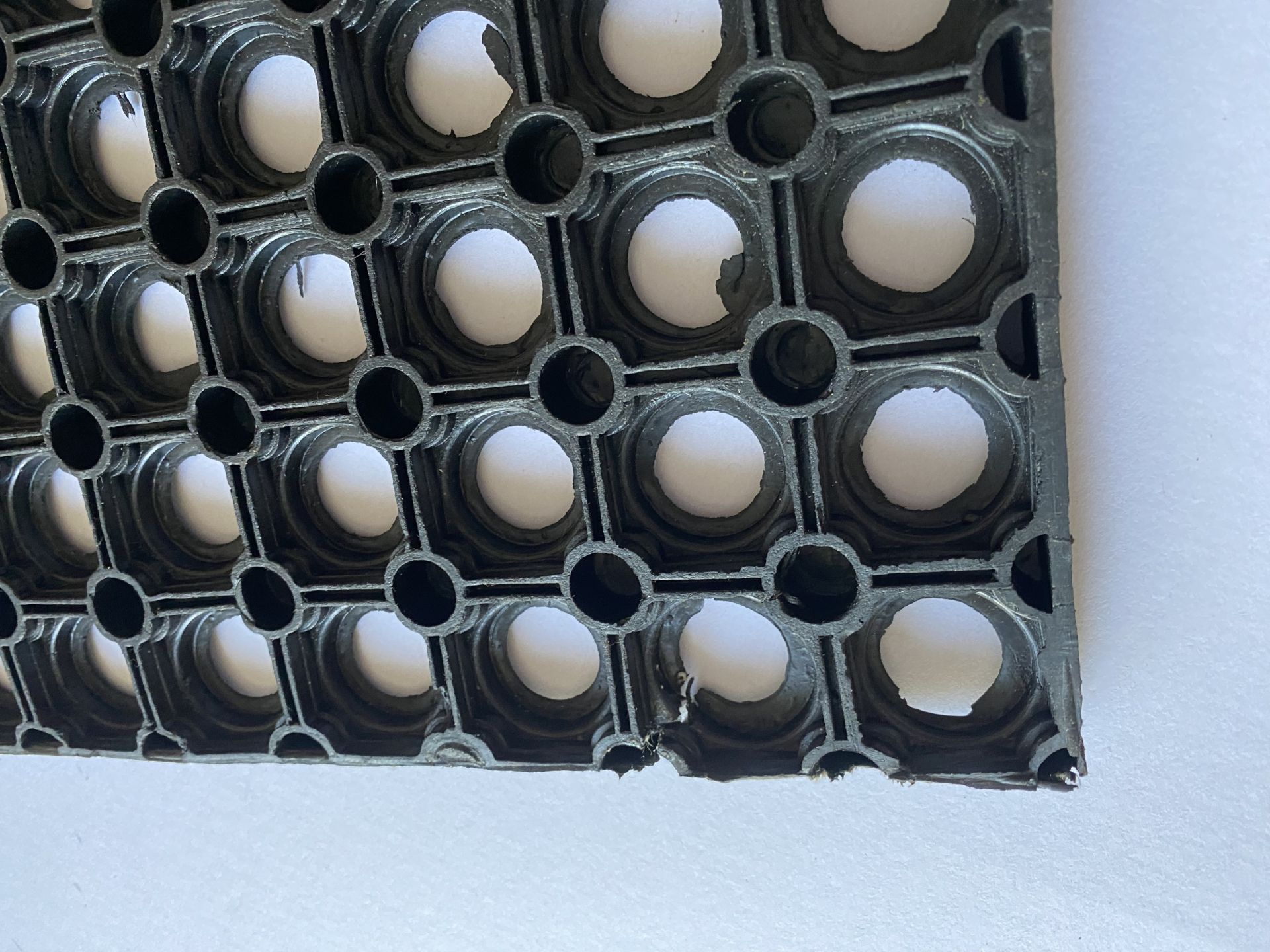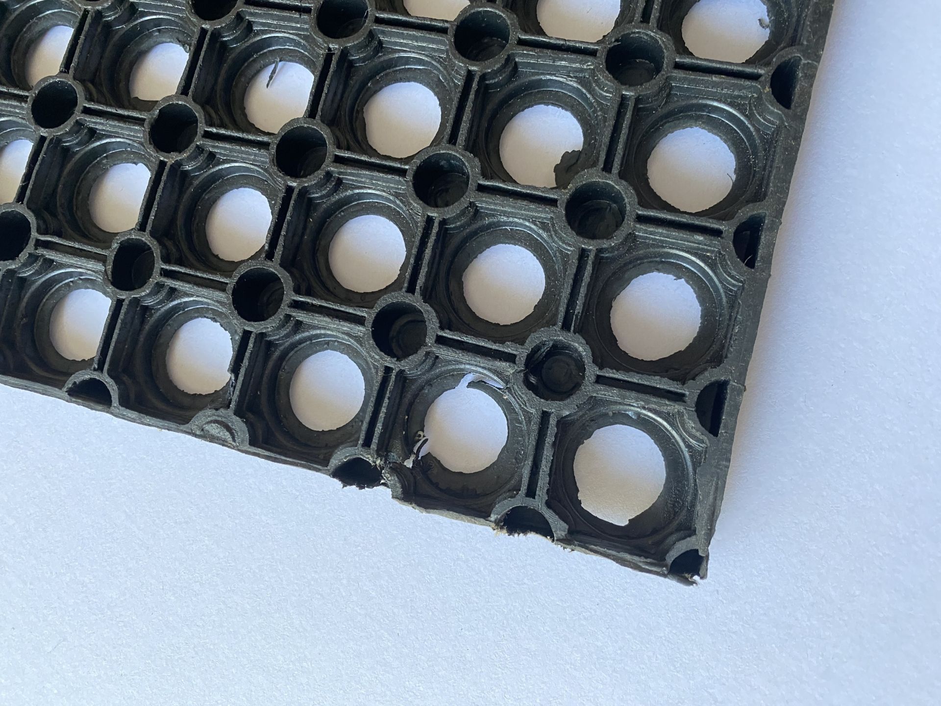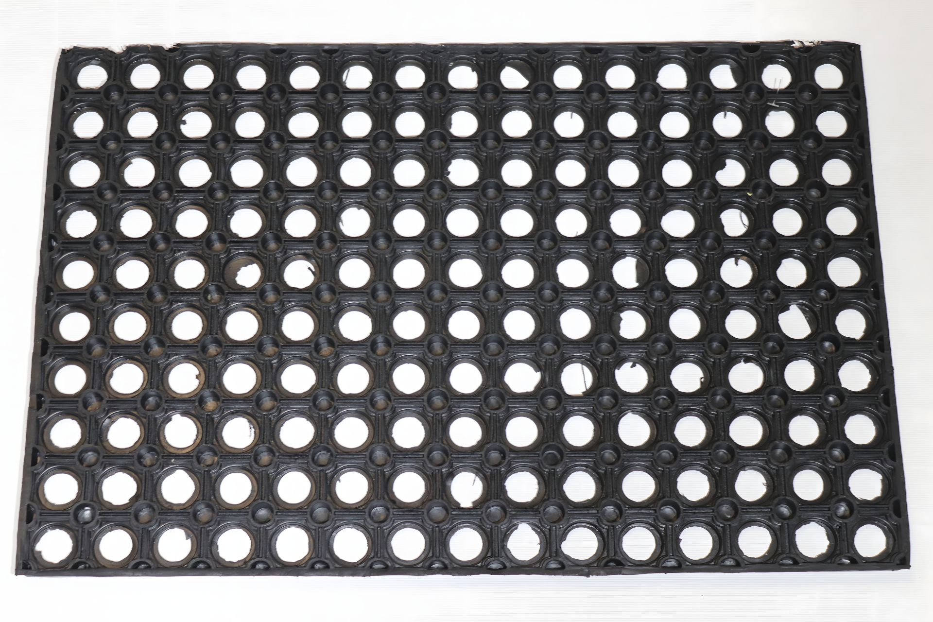 Килимок вхідний гумовий з наскрізним малюнком у вигляді "стільників". Має універсальне призначення, а саме зовні на вході, зсередини, в душ тощо, але найчастіше для грубого попереднього чищення взуття. Гумовий матеріал запобігає ковзанню. Дуже простий в обслуговуванні.