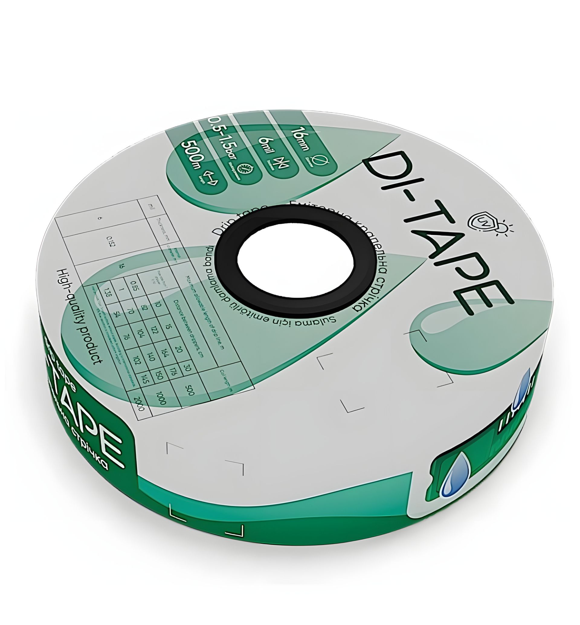 Крапельна стрічка Di-Tape (DI-10-500) це гнучка трубка з товщиною стінки 0.15 мм (6 mil) та вбудованими крапельницями (емітерами), які розташовуються через кожні 10 см, забезпечуючи максимально сприятливі умови для вирощуваних культур. Стрічка крапельного поливу має тривалий термін служби, завдяки вбудованим крапельницям стійка до засмічення та забезпечує більш точне та більш стабільне зрошення. Для запобігання забрудненню шкірна крапельниця має свій вбудований фільтр із лабіринтом у формі зубчастого каналу. Крапельниці вбудовані в стінку стрічки за допомогою екструзії і чинять мінімальний опір водяному потоку. Підвійна система захисту забезпечує максимальну надійність роботи крапельниць, за рахунок цього досягається точне, стабільне зрошення та висока однорідність поливу по всій довжині.