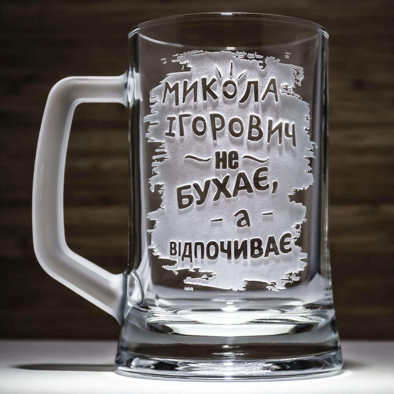 Пивний бокал з гравіюванням тексту ".. не бухає а відпочиває"
