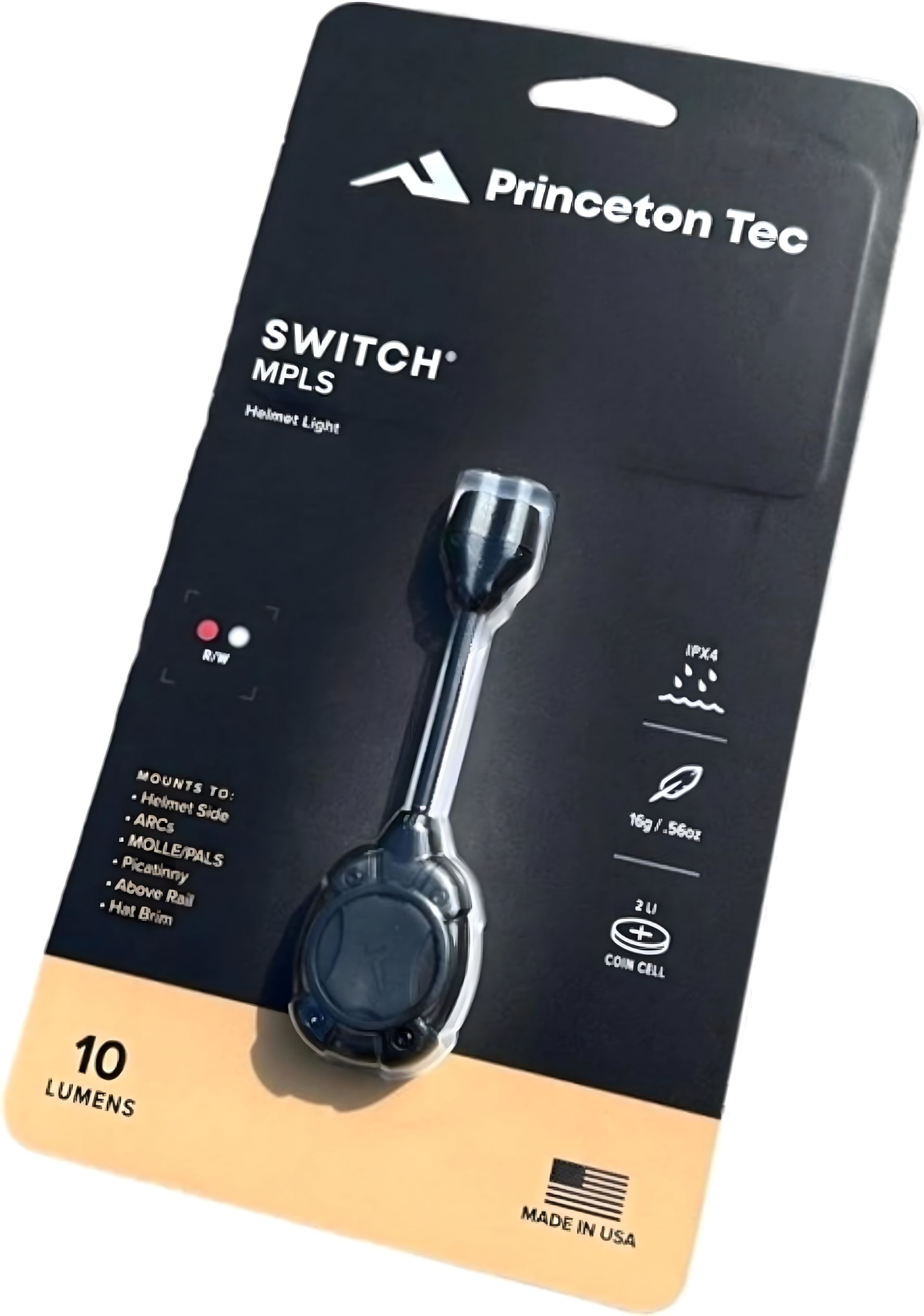 Princeton Tec Switch MPLS – ліхтар, спроектований для індивідуального використання за допомогою закріплення на шоломі. Невелика вага та відмінна гнучкість забезпечує зручність у використанні. Ліхтар розміщений на гнучкому штативі і має два світлодіоди: білий та червоний. Додатковий червоний світлодіод дозволяє виконувати завдання, що потребують малої помітності у нічний час доби. Ліхтар за замовчуванням включаються на низькій яскравості додаткового світлодіода. Яскравість регулюється за допомогою натискання на 2 секунди кнопки включення.