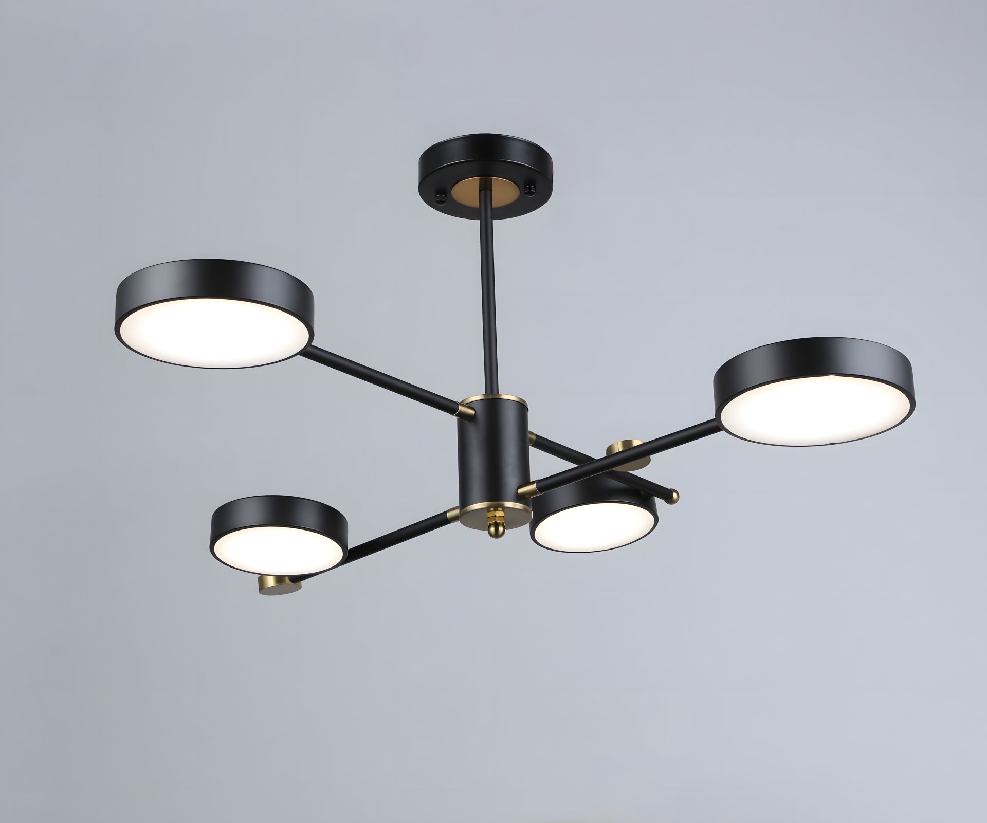 Каркас виконаний з високоякісного металу чорного та позолоченого кольору, що додає люстрі розкішного та сучасного вигляду. Чотири круглі плафони з акрилу рівномірно розподіляють світло, створюючи м'яке і приємне освітлення.