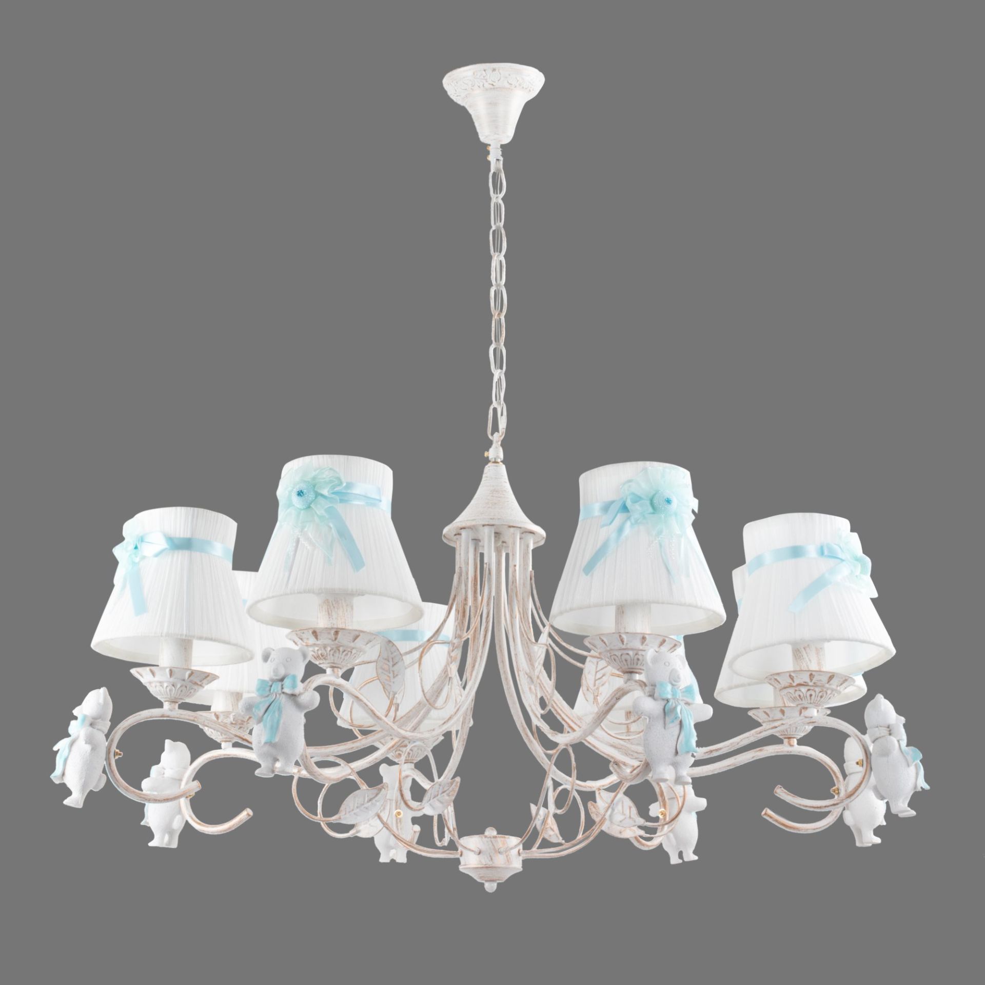 Ця надзвичайно чарівна люстра принесе в вашу дитячу кімнату особливий та незабутній шарм. Завдяки довжині 760 мм, ширині 760 мм та висоті 990 мм, вона створює величну атмосферу, яка вразить кожного. Каркас з металу білого кольору, підфарбований під старовину, прикрашений невеликими фігурками ведмедиків, що додає цій люстрі унікальний шарм та дитячий настрій.