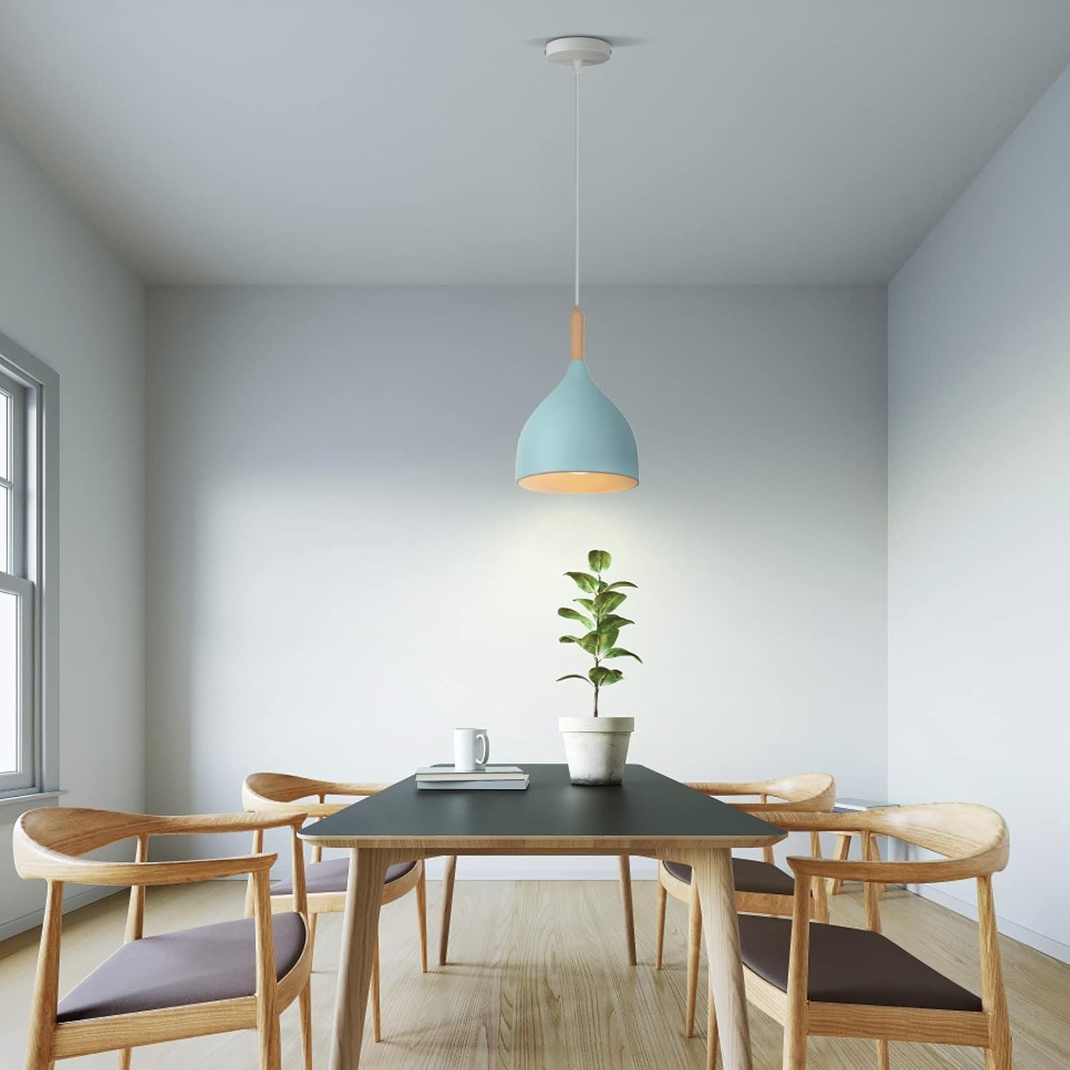 Каркас цієї вишуканої люстри виготовлений з металу блакитного кольору, що надає їй сучасний і стильний вигляд. Біля плафона розташований елемент дерева, що додає особливого шарму та природності дизайну.