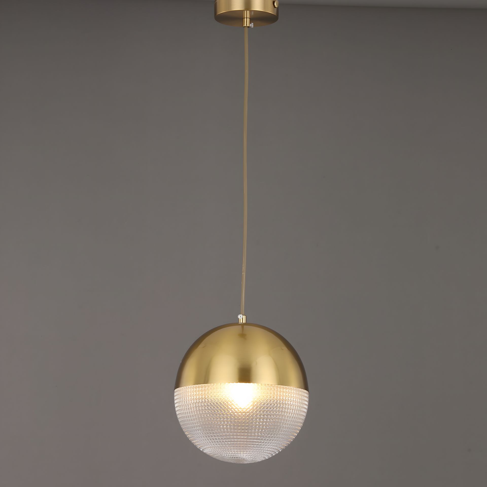 Круглий плафон зі скла гармонійно поєднується з бронзовим каркасом, створюючи м'яке, приємне освітлення. Така комбінація матеріалів і форм виглядає стильно та витончено.