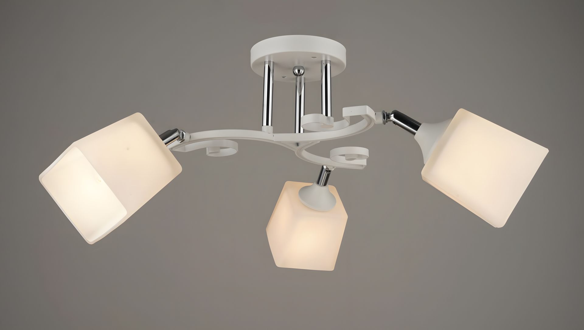Каркас виготовлений з металу в білому та хромовому кольорі, що надає люстрі сучасний і стильний вигляд. Три матово-білі плафони зі скла квадратної форми , створюють ефектні деталі та додають вишуканості до дизайну.