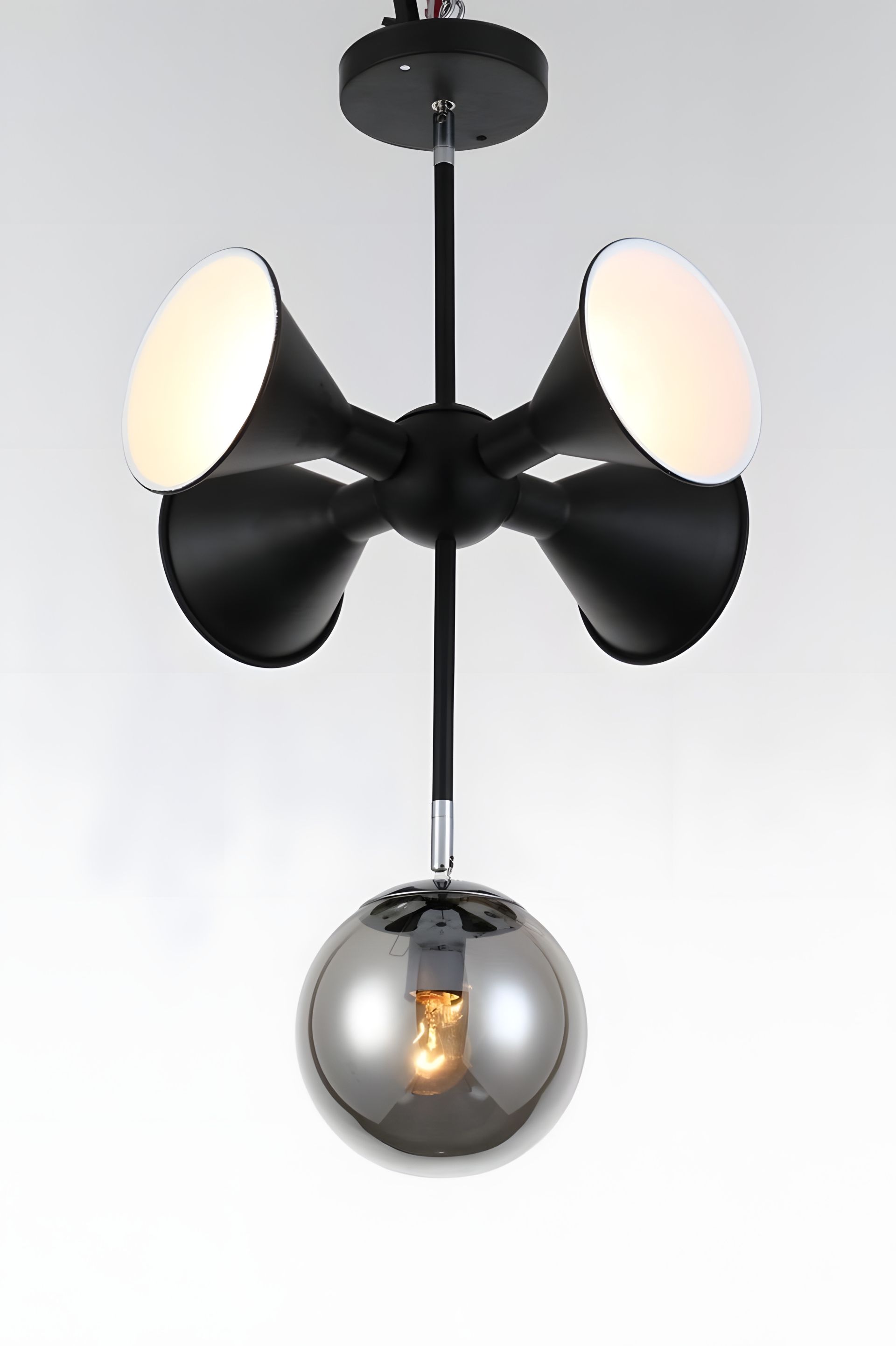 Каркас виготовлений з металу чорного кольору, що надає йому загадкового шарму. Цілком унікальною особливістю є 5 плафонів: 4 плафони з металу, що додають люстрі сміливості та сучасності, і один круглий плафон зі скла в хромовому відтінку, який надає цілому дизайну нотку ексклюзивності.