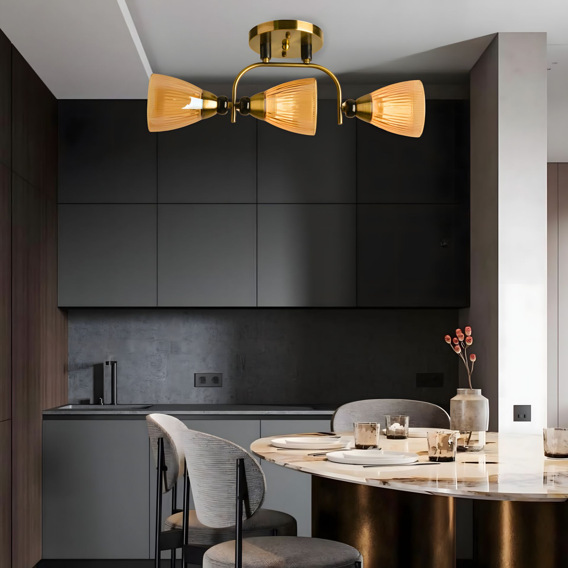 Плафони лампи мають конусну форму і виготовлені зі скла золотистого кольору. Кожен плафон спрямований у різні напрямки, створюючи цікавий ефект освітлення та гри світла. Золотисте скло додає теплоти і шарму до внутрішнього простору.