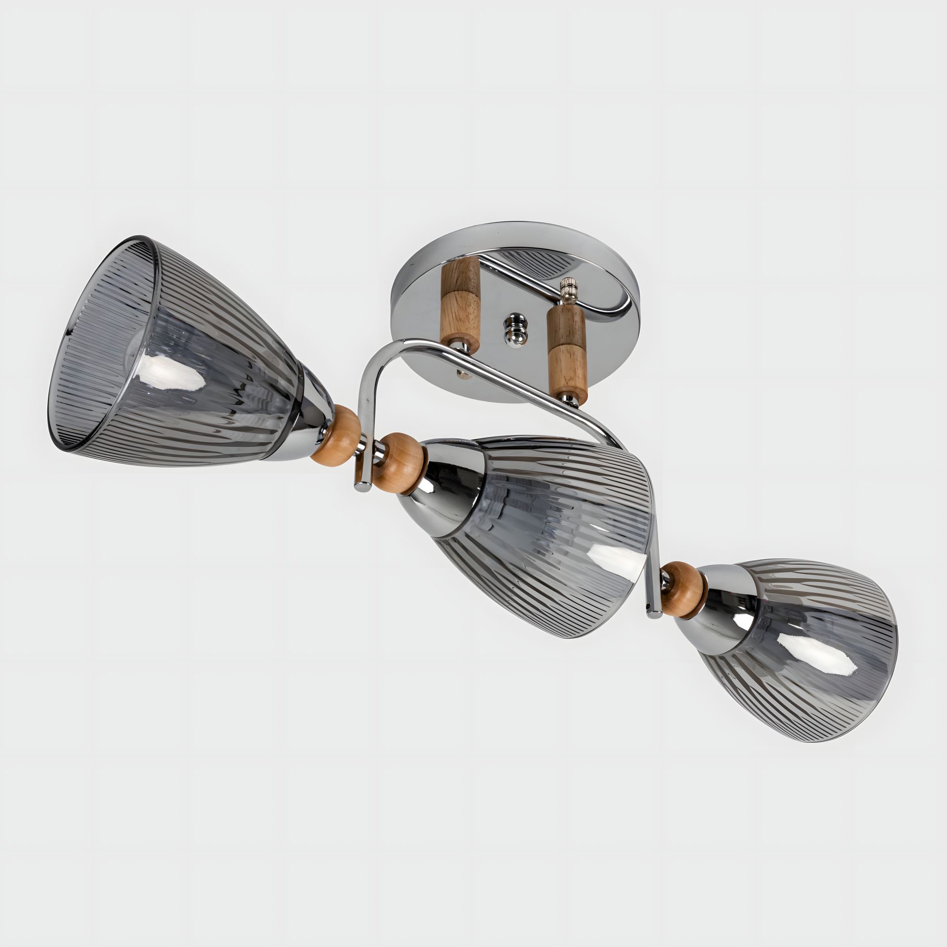 Плафони лампи мають конусну форму і виготовлені зі скла хромового кольору. Кожен плафон спрямований в різні напрямки, створюючи цікавий ефект освітлення та гри світла. Хромове скло додає блиску і стильності до внутрішнього простору.
