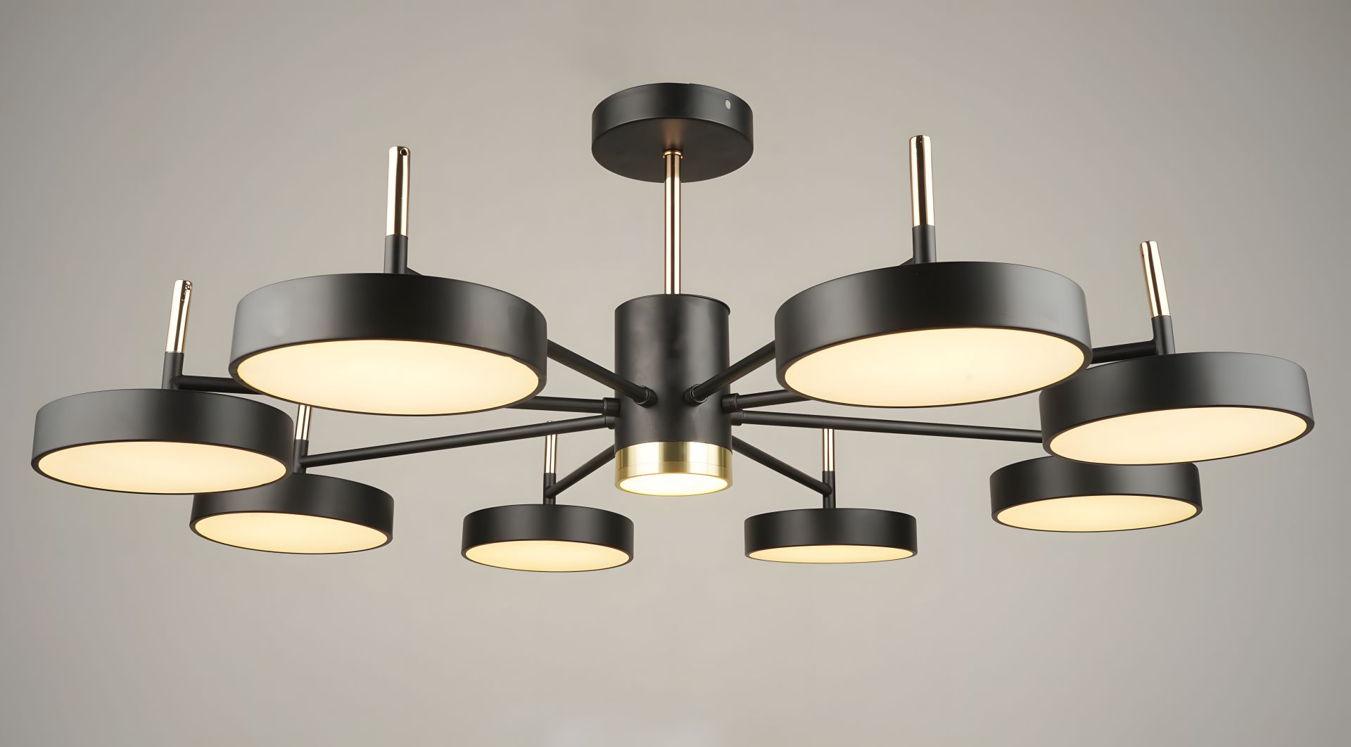 Каркас виготовлений з міцного металу чорного та позолоченого кольору, що додає люстрі сучасного та стильного вигляду. Вісім круглих плафонів виготовлені з акрилу рівномірно розподіляють світло, створюючи затишну атмосферу.