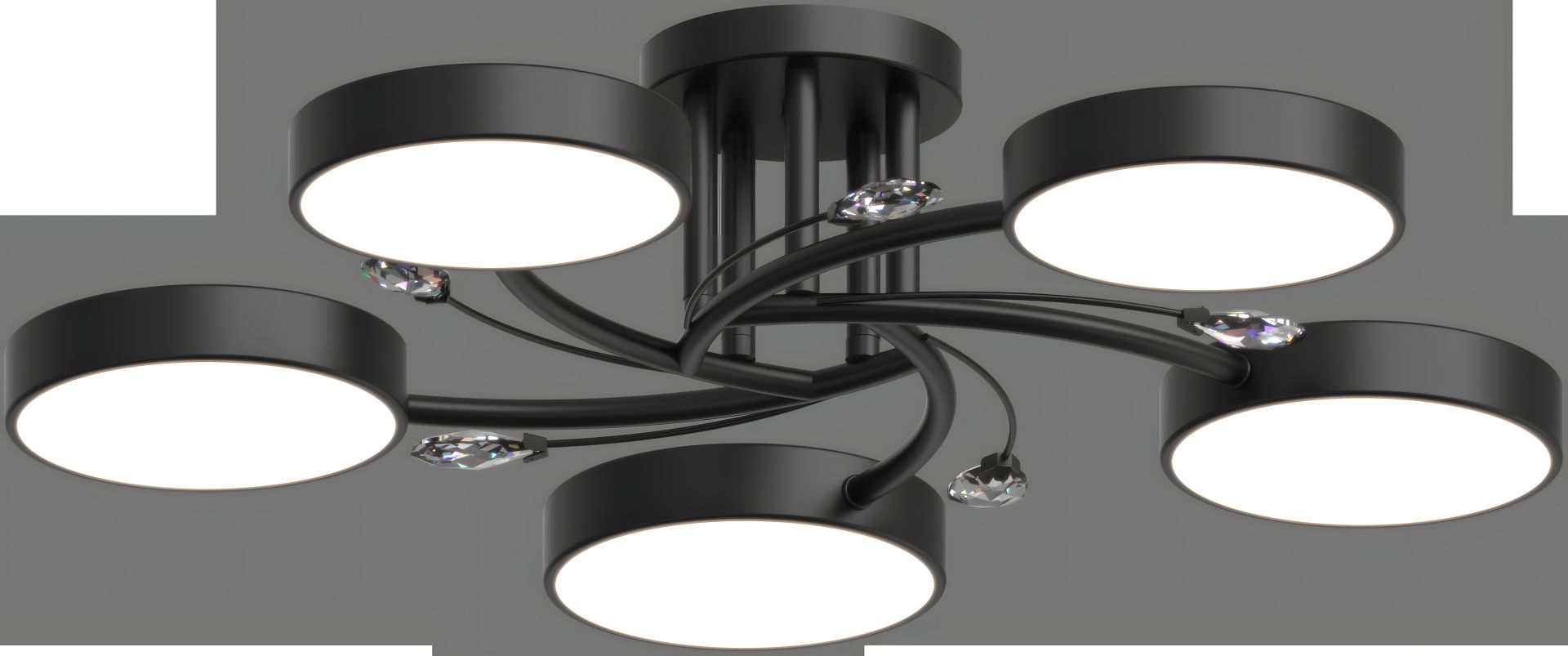 Каркас виготовлений з міцного металу чорного кольору, забезпечуючи надійність і довговічність. П'ять плафонів з акрилу круглої форми, також чорного кольору, рівномірно розподілять світло в приміщенні, створюючи приємну атмосферу.