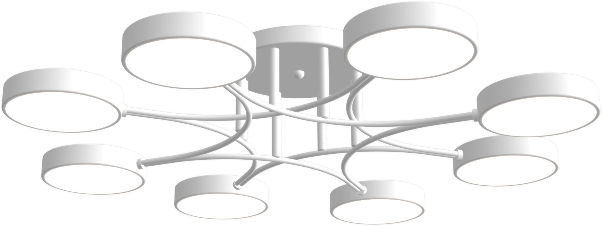 Каркас виготовлений з міцного металу білого кольору, забезпечуючи надійність і довговічність. Вісім плафонів з акрилу круглої форми білого кольору, рівномірно розподілять світло в приміщенні, створюючи приємну атмосферу.