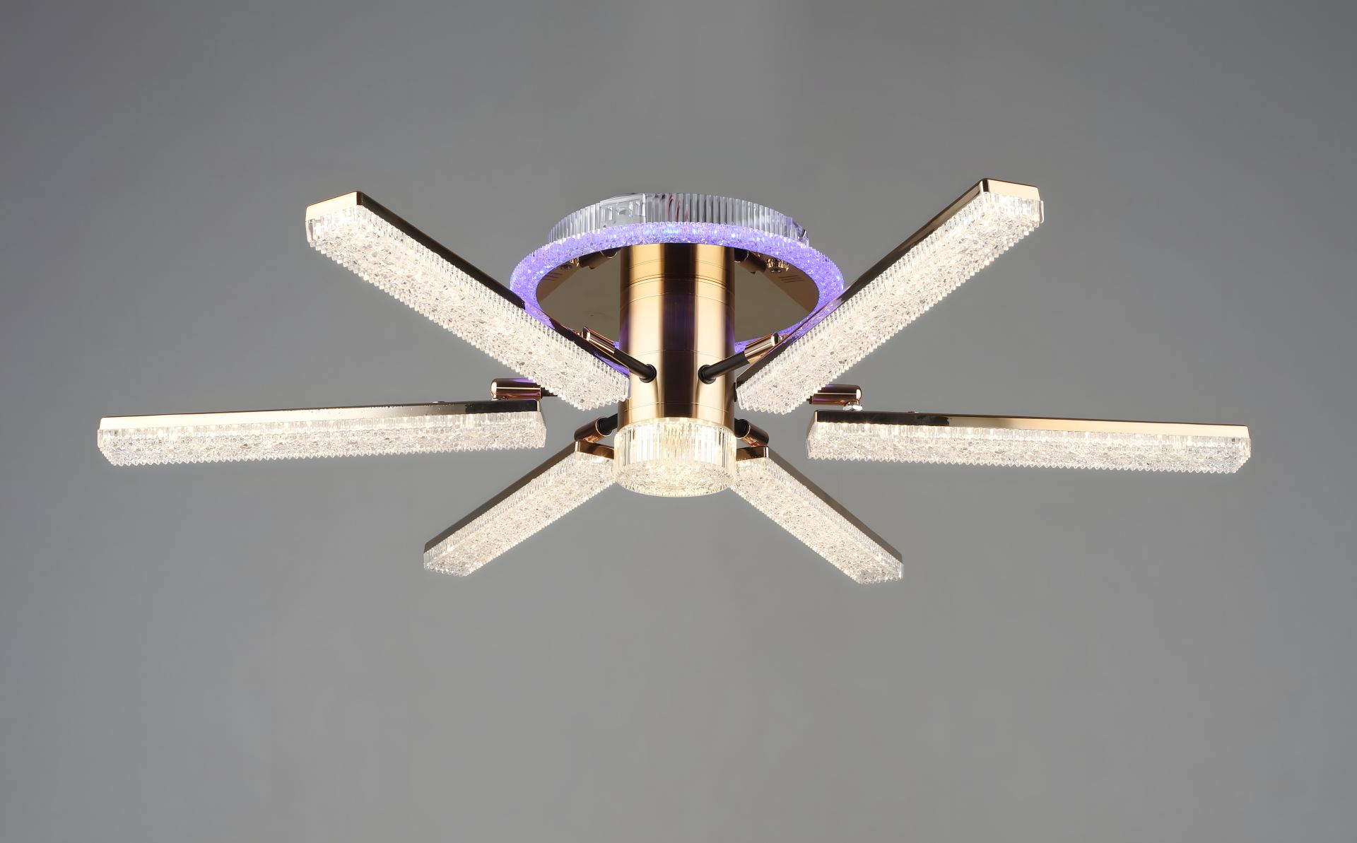 Благородний металевий каркас у золотому та чорному кольорах, разом з шістьма акриловими плафонами , виражає не лише сучасний дизайн, але та елегантність. Вбудована підсвітка корпусу та зручний пульт в комплекті додають функціональність та комфорт в користуванні.