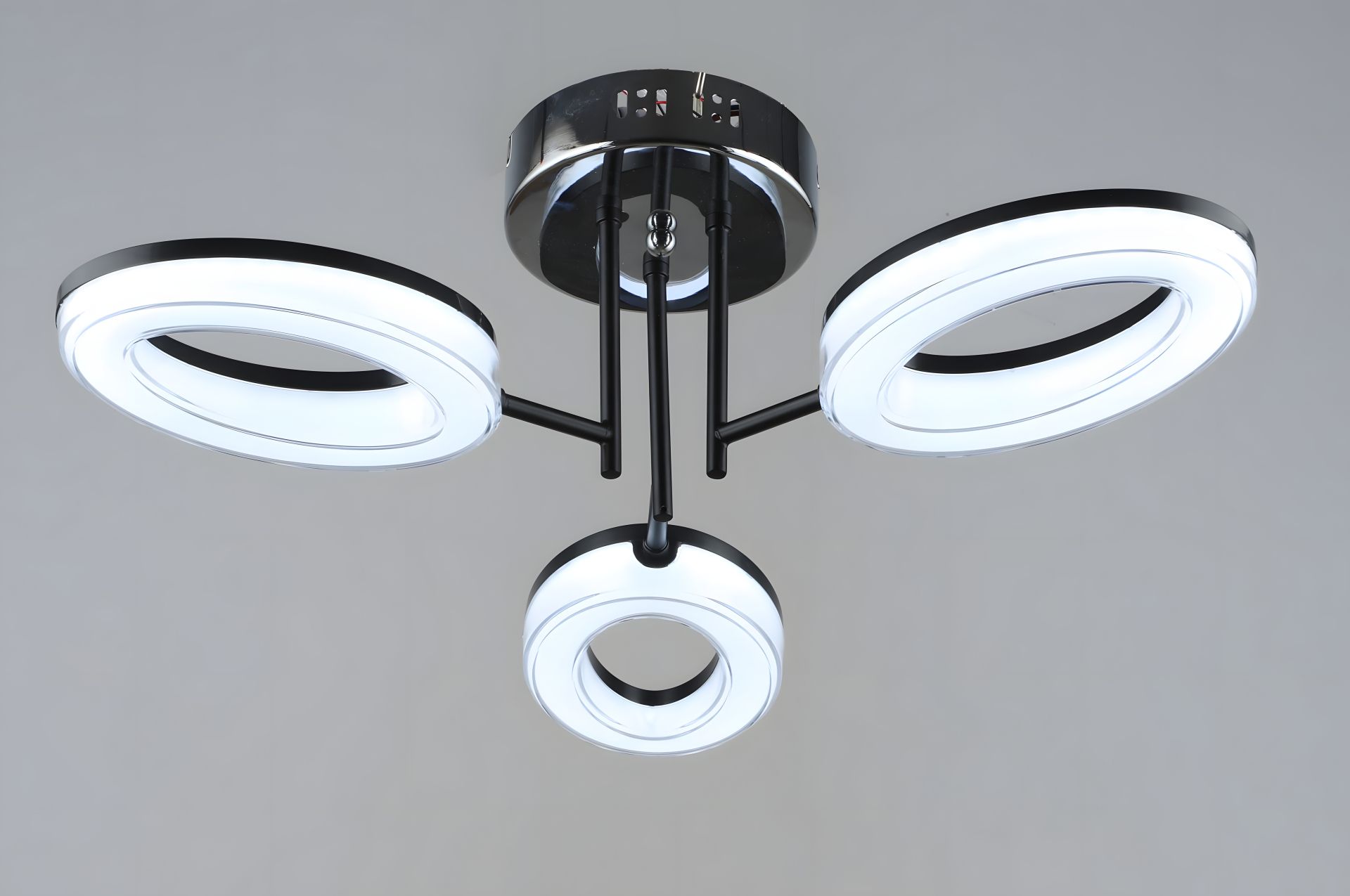 Елегантний каркас із металу чорного та хромового кольору надає люстрі сучасного вигляду, а три акрилові плафони створюють приємне та рівномірне освітлення. Розмір люстри – діаметр 610 мм, висота 175 мм – робить її ідеальною як для просторих, так і для компактних приміщень.