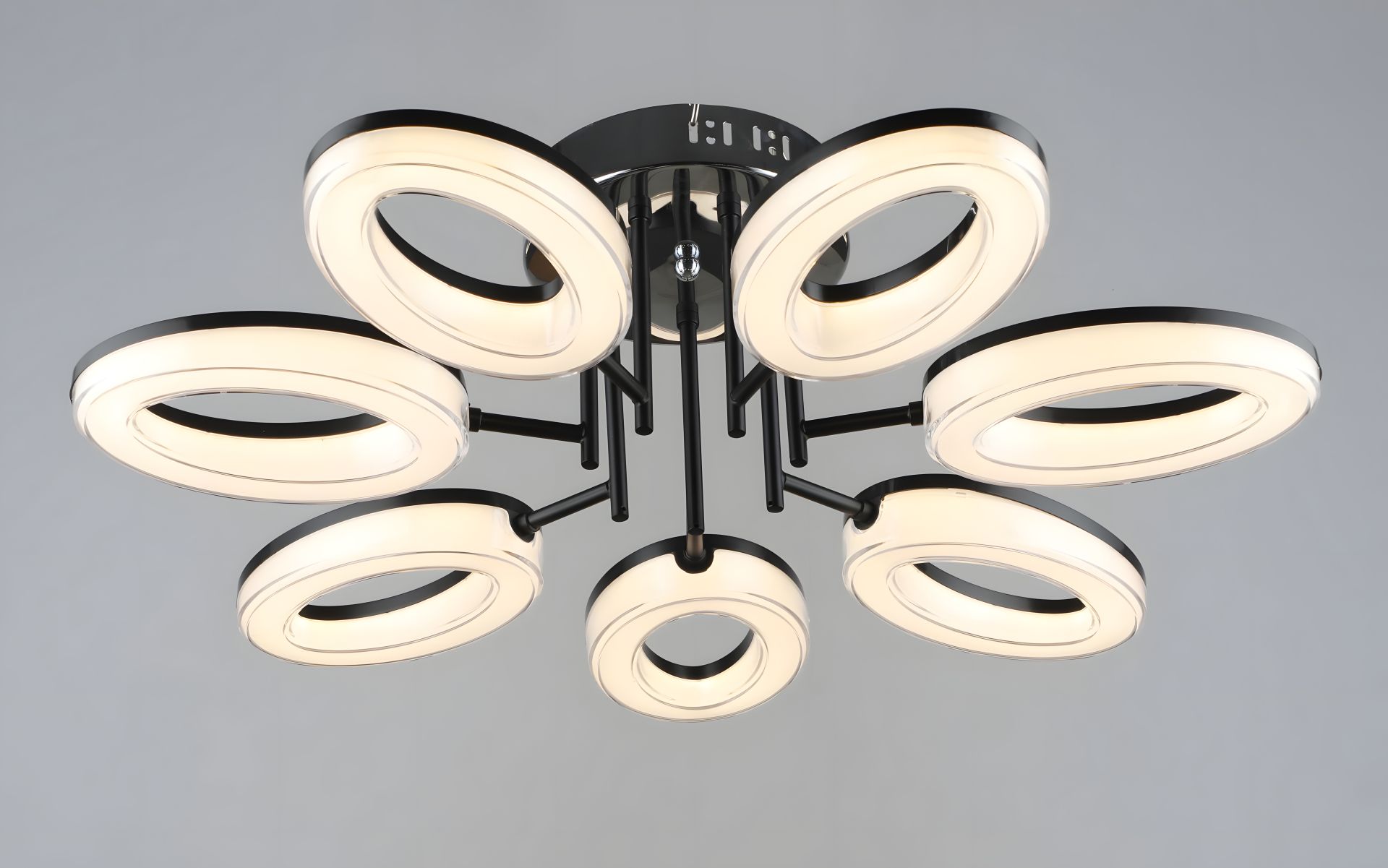 Елегантний каркас із металу чорного та хромового кольору надає люстрі сучасного вигляду, а сім акрилових плафонів створюють приємне та рівномірне освітлення. Розмір люстри – діаметр 660 мм, висота 175 мм – робить її ідеальною як для просторих, так і для компактних приміщень.