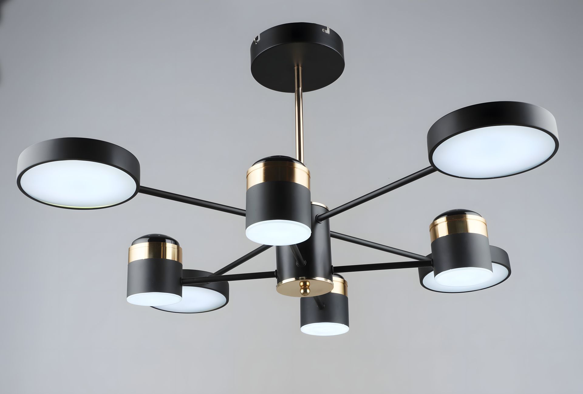 Каркас виготовлений з міцного металу чорного та золотого кольорів, що створює стильний контраст та робить люстру центральним елементом інтер’єру. Вісім акрилових плафонів забезпечують рівномірне, м'яке світло, яке наповнить кімнату затишком.