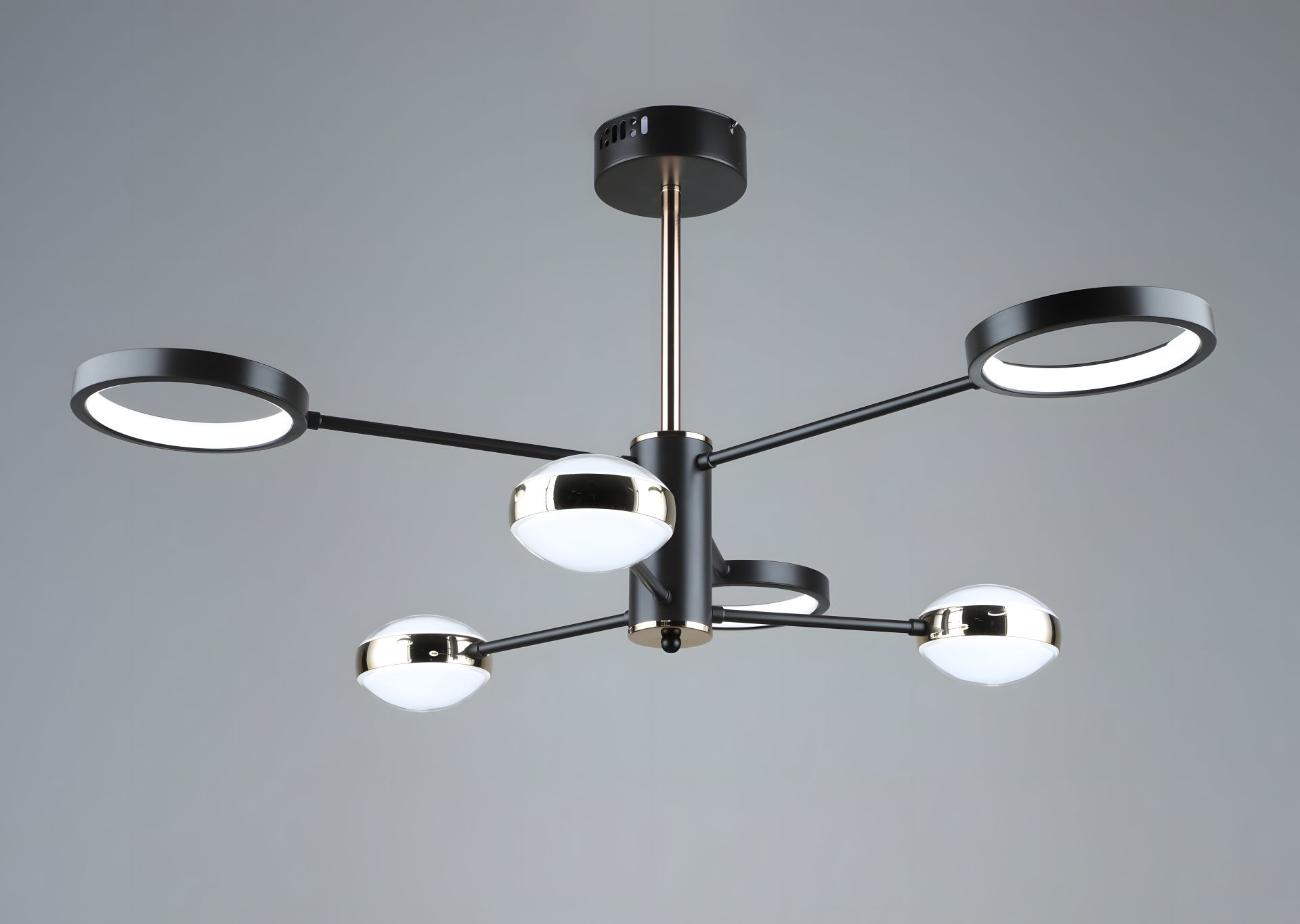 З діаметром 900 мм та висотою 410 мм, каркас з металу в кольорі кави та позолоти виокремлюється своєю розкішшю та стилем. Шість плафонів - три зі скла та три з акрилу - створюють чудовий концерт світла та тіней, що додає унікальність інтер'єру.