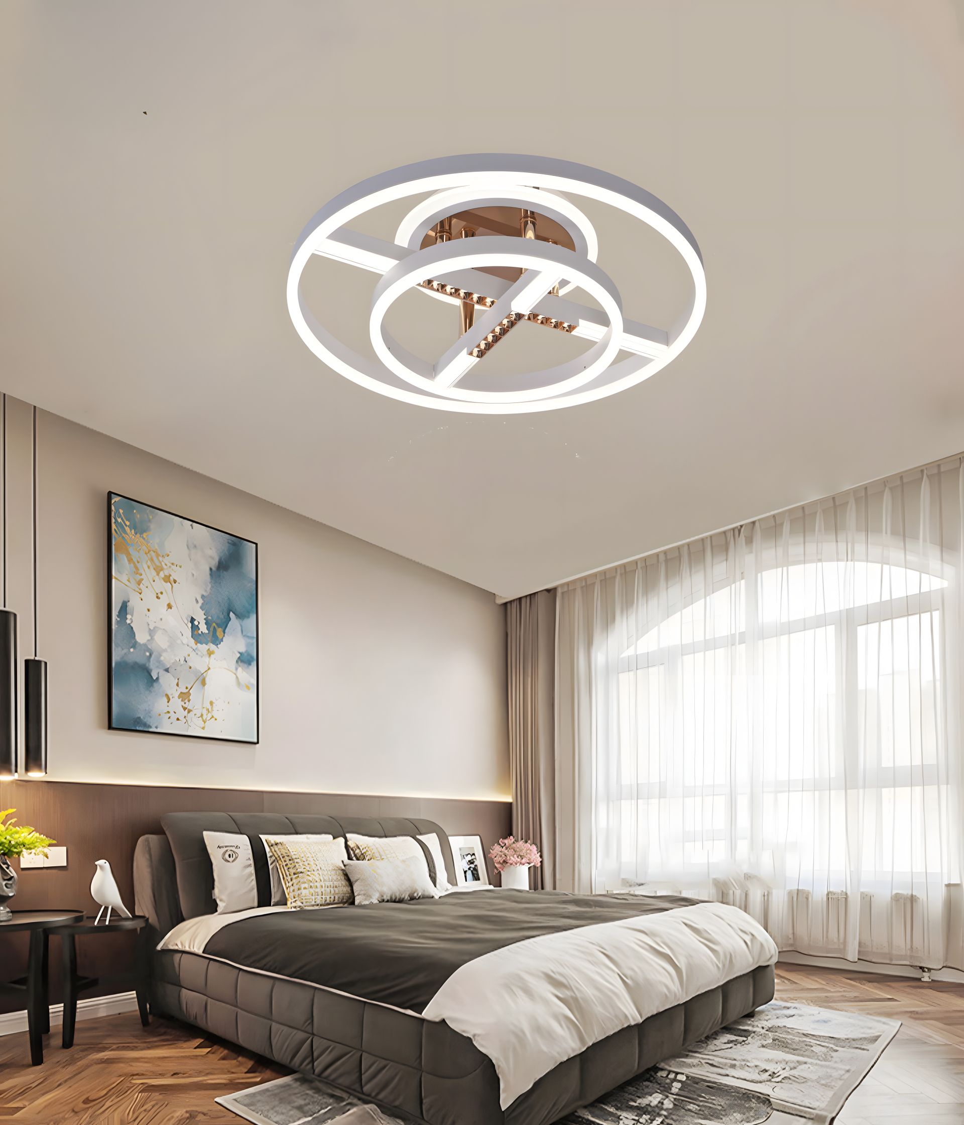 Каркас люстри виготовлений з високоякісного металу білого кольору з елегантними золотими акцентами. Акрилові плафони, виконаний у формі кола, додають виробу сучасного шарму та забезпечує рівномірне розсіювання світла.