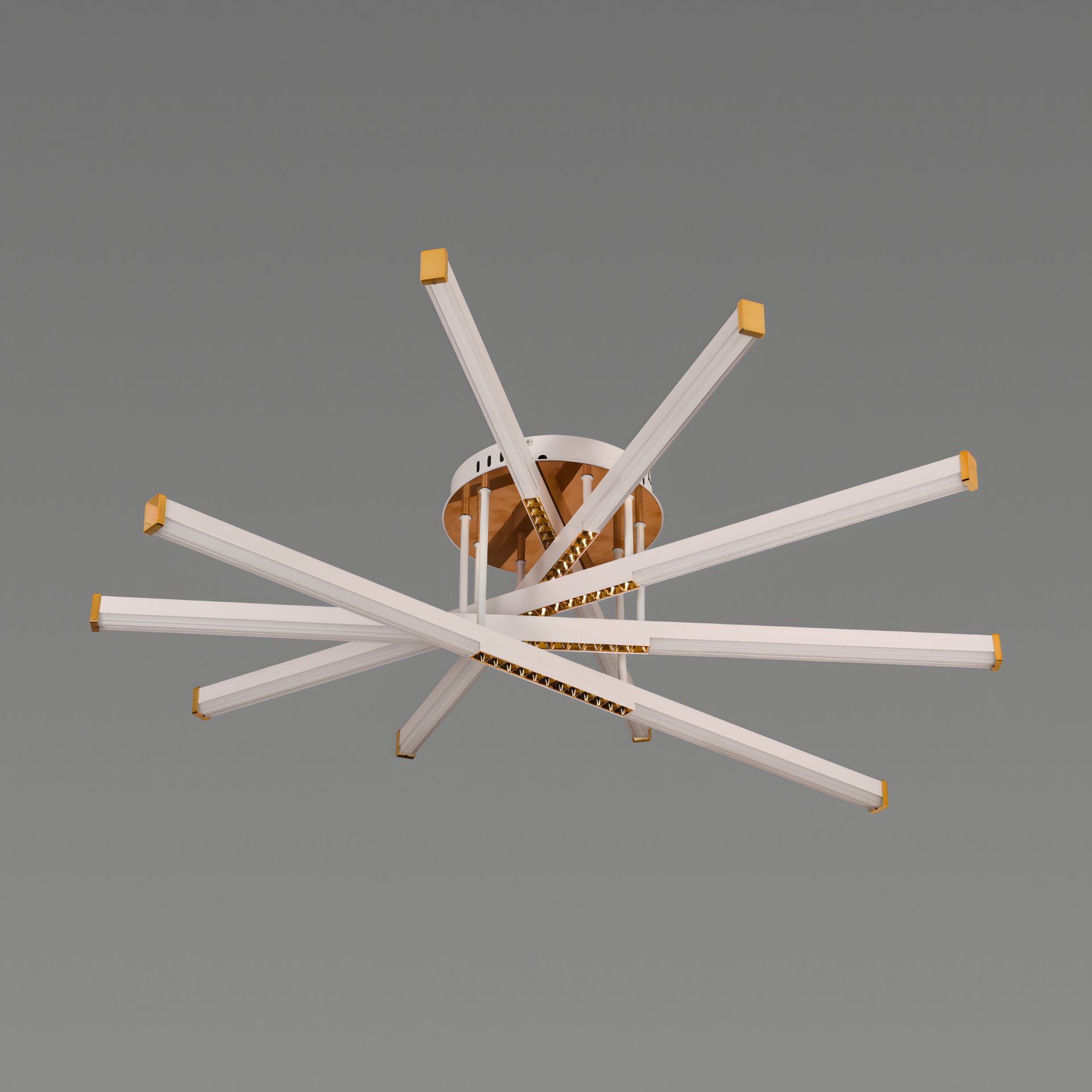 Каркас люстри виготовлений з високоякісного металу білого кольору з елегантними золотими акцентами. Акрилові плафони, додають виробу сучасного шарму та забезпечує рівномірне розсіювання світла.