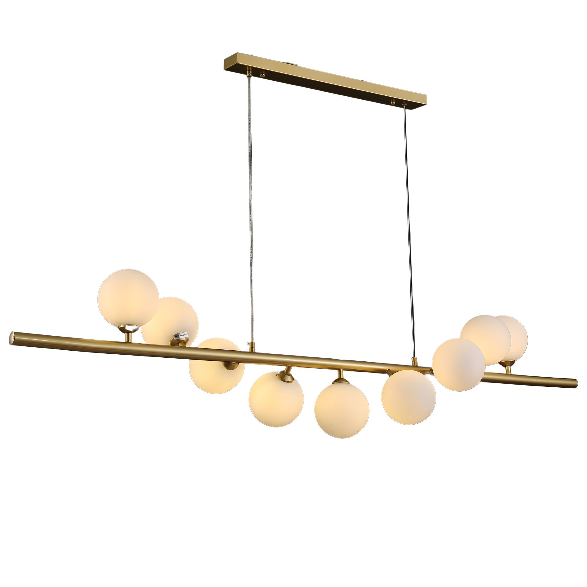 Люстра має універсальну підвісну конструкцію, що дозволяє регулювати висоту її встановлення залежно від особливостей приміщення. Це робить її ідеальним рішенням для просторих віталень, обідніх зон або стильних холів. Завдяки гармонійному поєднанню золотого кольору та білих скляних елементів модель легко інтегрується в різні дизайнерські концепції – від класичного до сучасного інтер'єру.