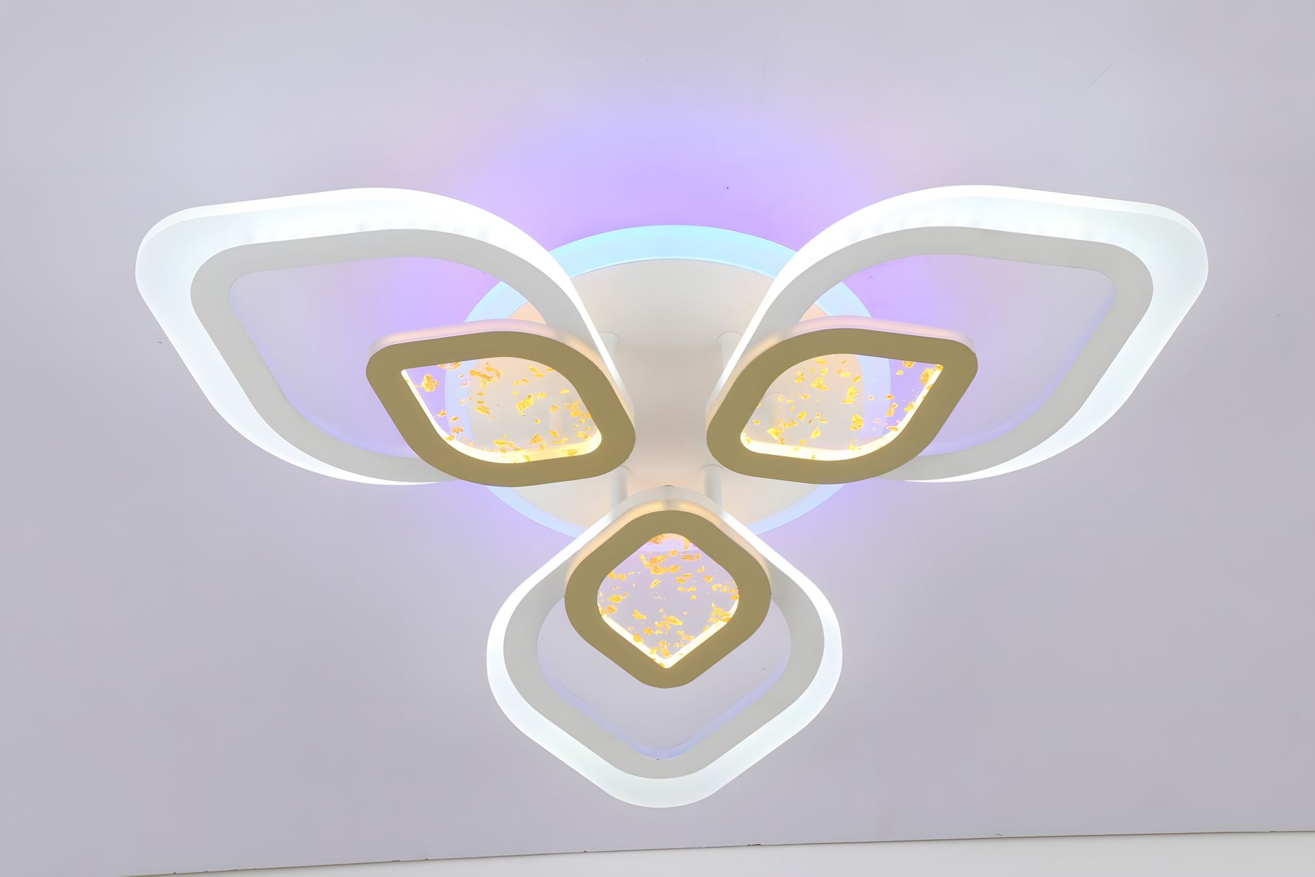 Завдяки своїй довжині 600 мм, ширині 600 мм і висоті 95 мм, ця люстра додасть приміщенню вишуканості та сучасності. Каркас виготовлений з міцного металу золотого кольору . Три плафонів з акрилу білого та золотого кольору додають елегантності та симетрії до дизайну.