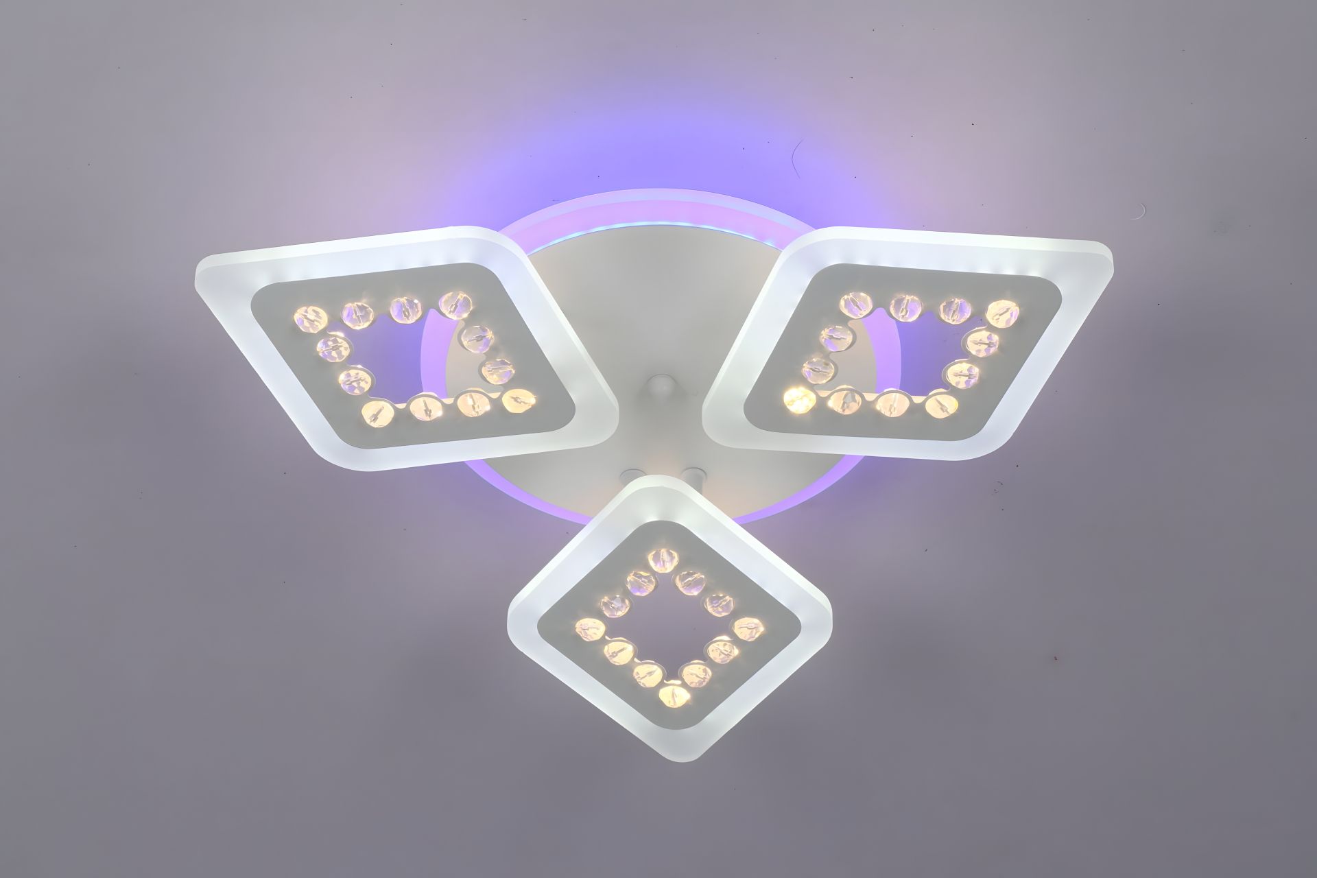 Характеризуючи дану люстру, перше, що варто відзначити, це її три плафони форма ромбу з акрилового матеріалу. Такий дизайн відмінно вписується в сучасний інтер'єр і створює чистий, сучасний образ. Білий колір додає контрасту та елегантності, роблячи цю люстру стильним акцентом в приміщенні.Розмір люстри довжина 500мм,ширина 500 мм,висота 80мм.