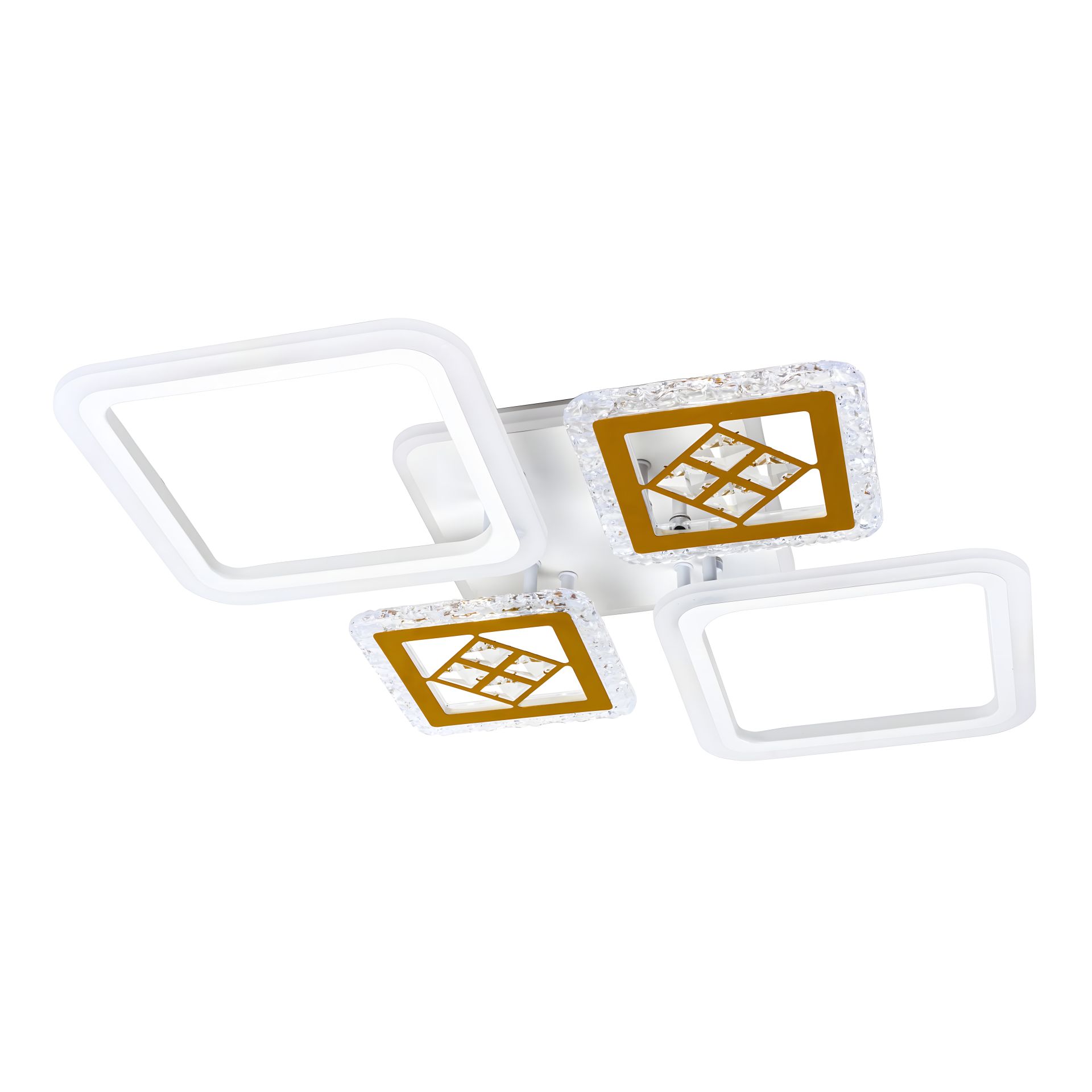 Завдяки розмірам - довжина 750 мм, ширина 510 мм, висота 80 мм - та каркасу з металу білого кольору, ця люстра створює вишуканий акцент у вашому просторі. Чотири плафони з акрилу, квадратної форми, в білому та золотому кольорах, додають особливий шарм та стиль.