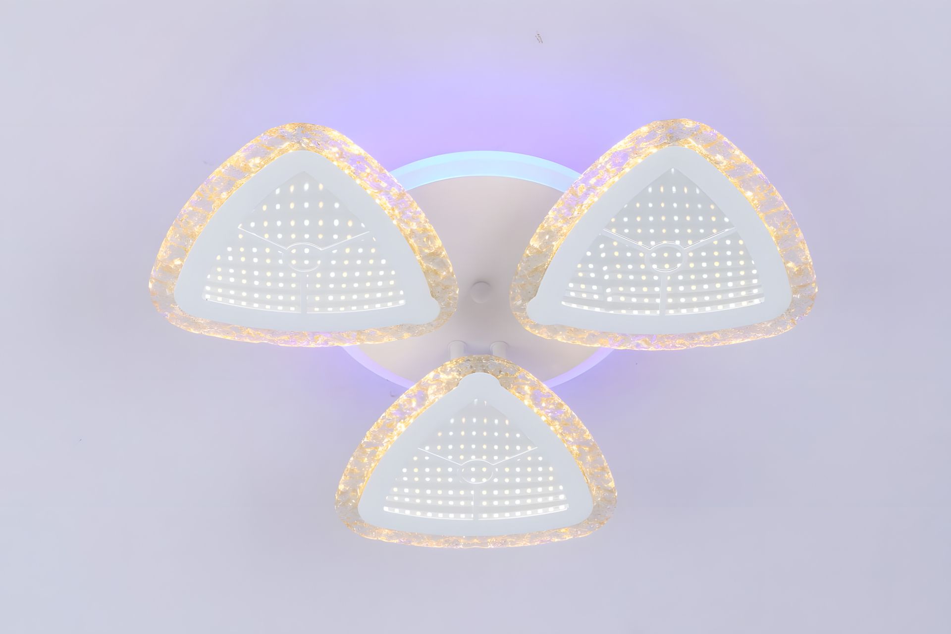 Завдяки розмірам - довжина 460 мм, ширина 460 мм, висота 80 мм - та каркасу з металу білого кольору, ця люстра створює вишуканий акцент у вашому просторі. Три плафони з акрилу, трикутної форми, в білому кольорі, додають особливий шарм та стиль.