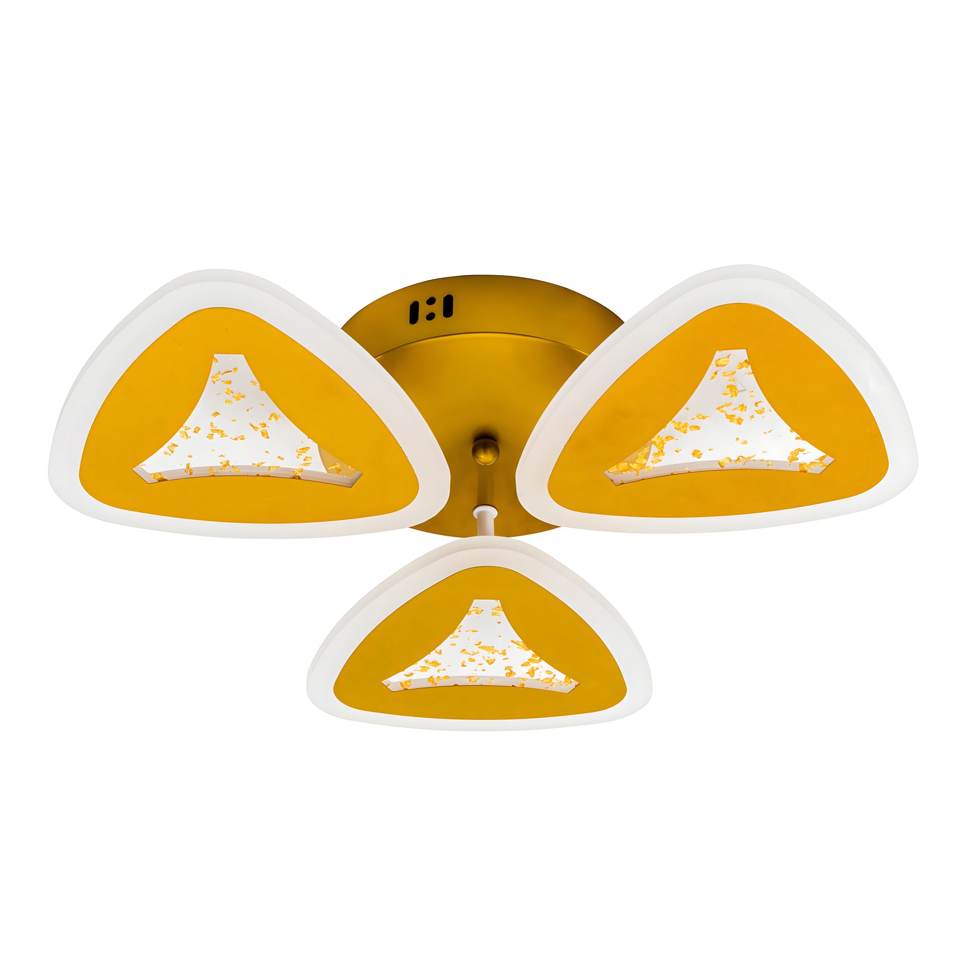 Діаметр 440 мм та висота 80 мм роблять її ідеальним вибором для кухні, спальні, вітальні або кабінету. Золотистий каркас з металу додає вишуканості та стилю, а три плафони у формі трикутників золотого кольору розсіюють світло рівномірно, створюючи неповторний світловий пейзаж.