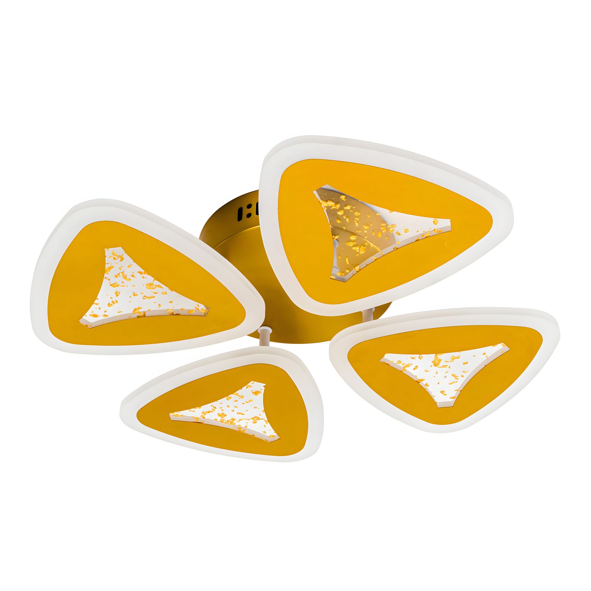 Діаметр 460 мм та висота 80 мм роблять її ідеальним вибором для кухні, спальні, вітальні або кабінету. Золотистий каркас з металу додає вишуканості та стилю, а чотири плафони у формі трикутників золотого кольору розсіюють світло рівномірно, створюючи неповторний світловий пейзаж.