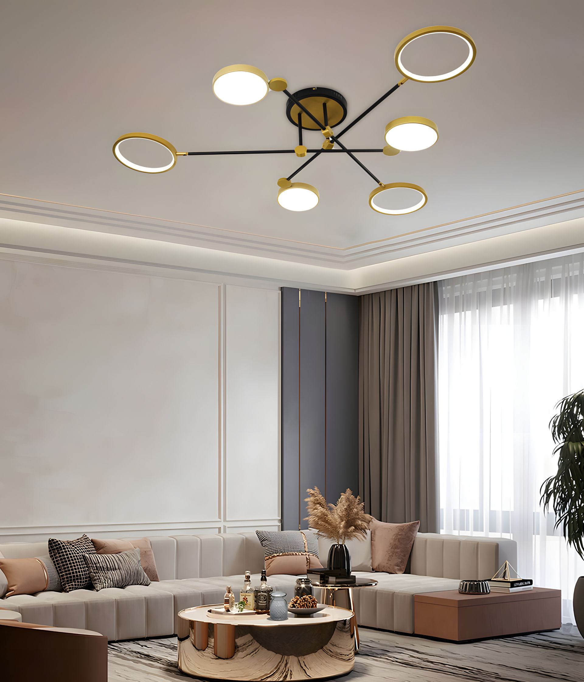 З шістьма плафонами круглої форми золотого кольору, ця люстра рівномірно розподілить світло по всьому приміщенню, створюючи приємну та затишну атмосферу.