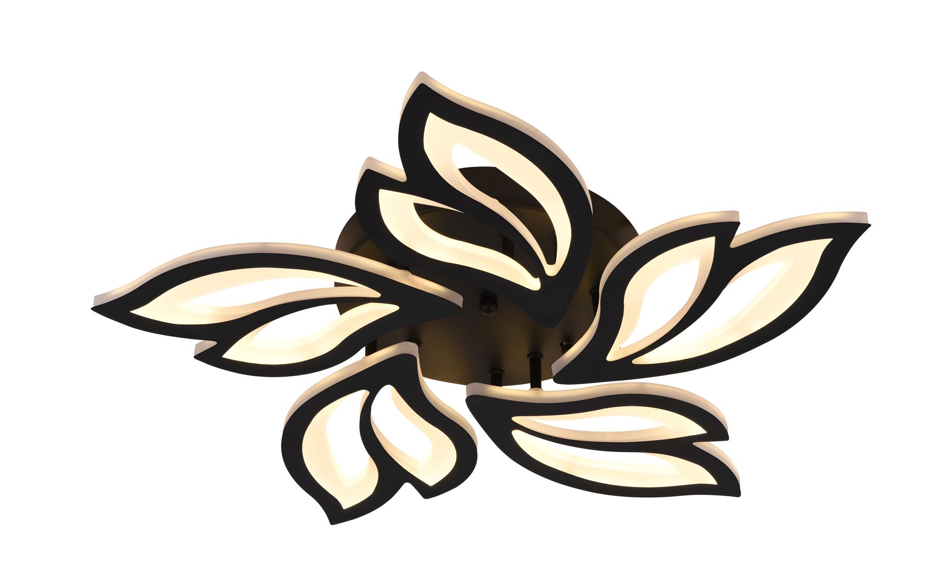 П' ять плафонів з акрилу, також чорного кольору, розсіюють світло рівномірно, створюючи приємне та затишне освітлення. Потужність люстри - 68 ватт, гарантує достатню яскравість для вашого приміщення, а регульована температура світла від теплого до холодного, забезпечує зручний та адаптований комфорт за допомогою пульта, який йде в комплекті.