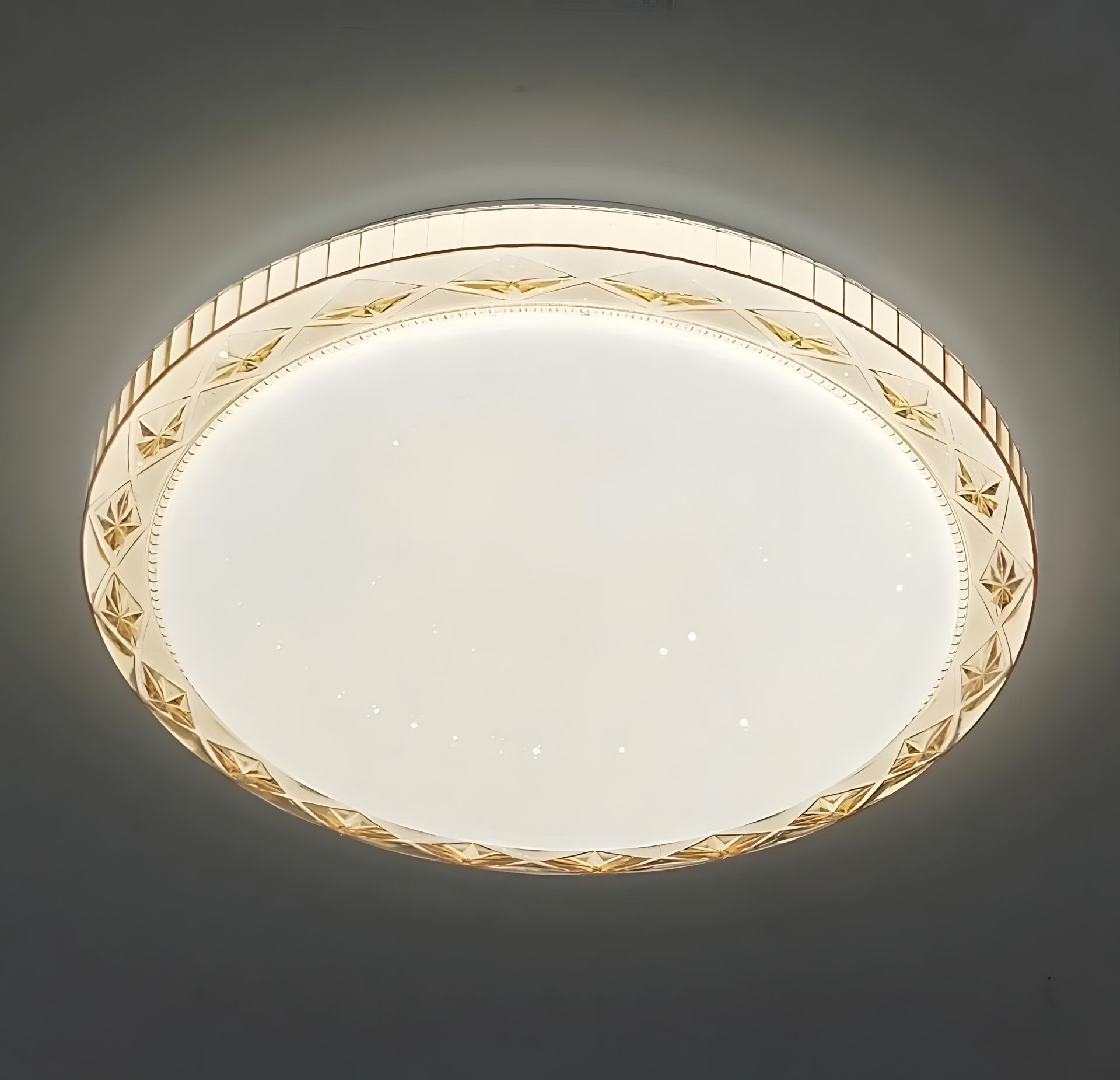 Вона виконана в білому кольорі та має круглу форму, що додає чистоти та свіжості в вашу кімнату. Матеріал плафона пластик розсіює світло рівномірно, створюючи приємний і яскравий світловий ефект.Потужність люстри 72 Ватт.